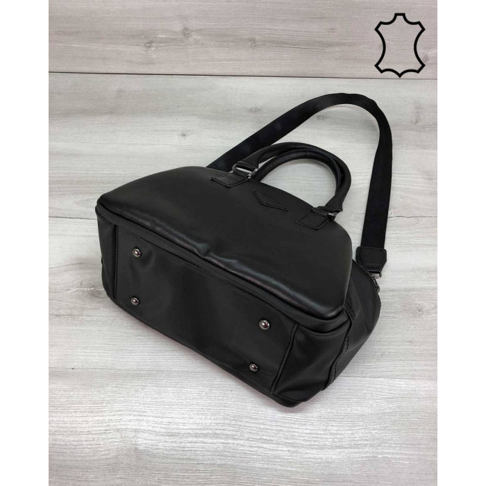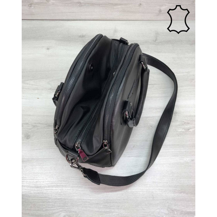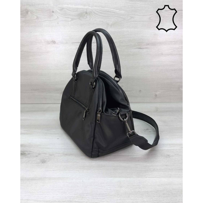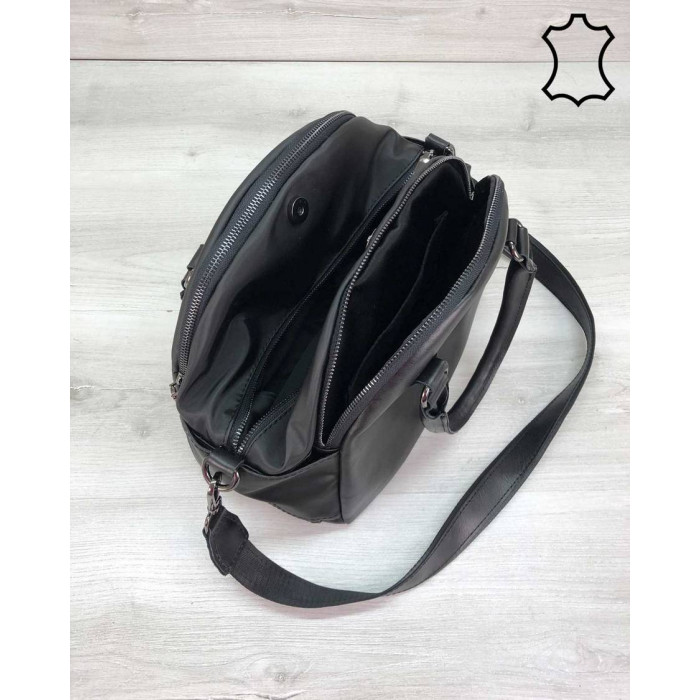 Стильна жіноча сумка "Elis" чорного кольору компанії WeLassie - це новий шедевр нашої фабрики. Передня частина ручки і вставочки виконані з високоякісної лицьової шкіри. Решта частини виконані з спеціальної водовідштовхувальної плащівки. Поєднання натуральної шкіри і тканини робить сумку еластичною, м'якою при будь-якій від'ємній температурі.