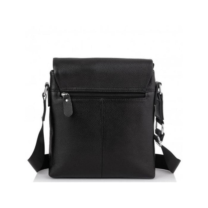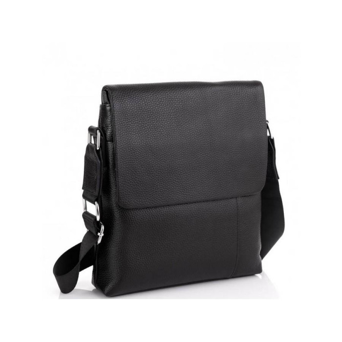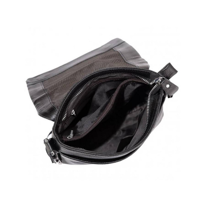 Мессенджер чорного кольору виконаний з натуральної шкіри зернистої структури. Текстильний плечовий ремінь регулюється по довжині, фурнітура срібного кольору. Усередині сумки - два основних відділення, дві кишені на замку і кишеня відкритого типу. З лицьового боку сумки - відкрита кишеня, з тильної - кишеня на замку. Закривається сумка через плече клапаном на магнітах.