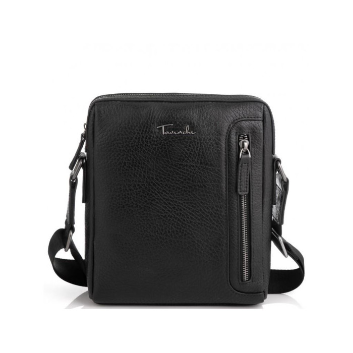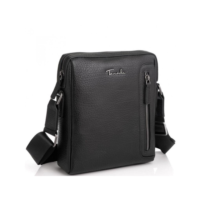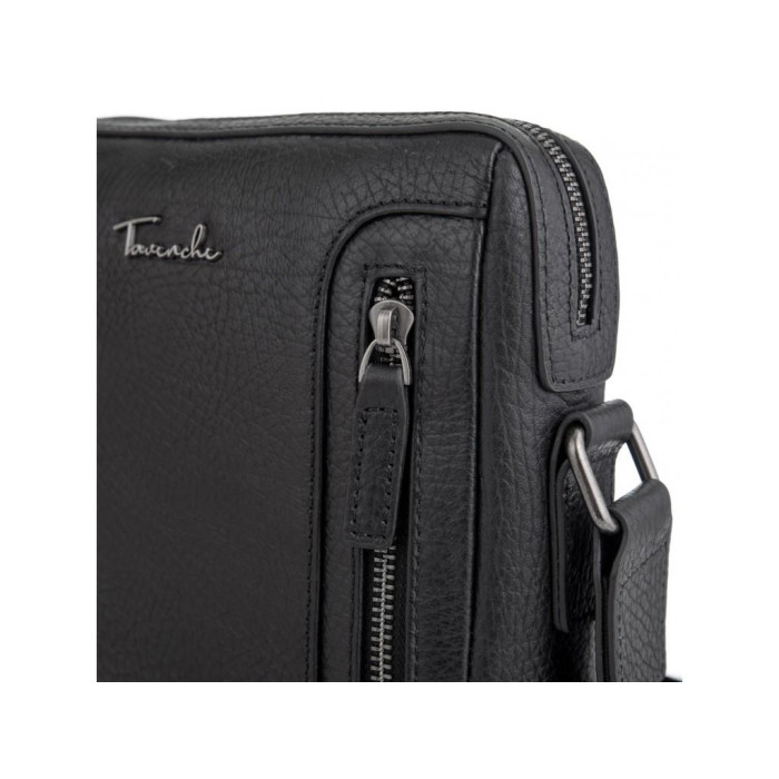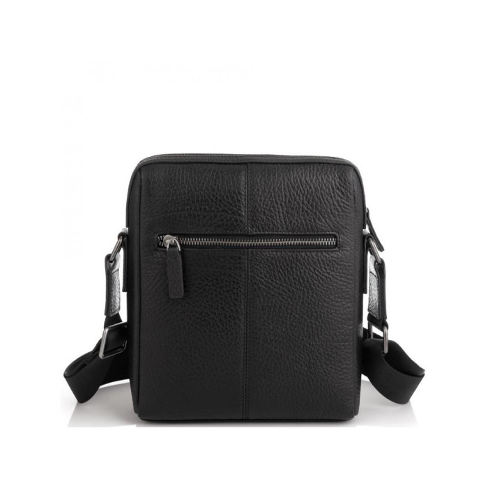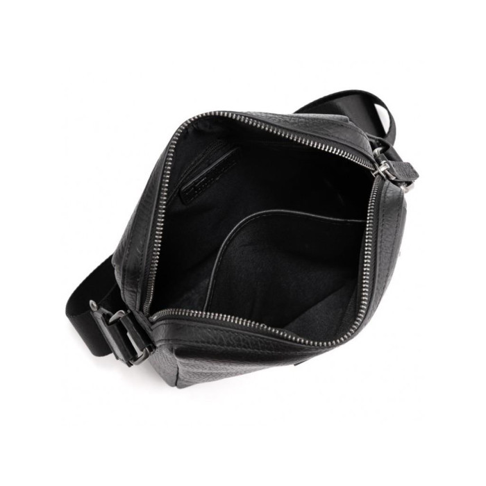 Шкіряна чорна сумка з італійської шкіри з зернистою текстурою. Сумка оснащена плечовим текстильним ременем, шкіряними пуллерами і має чорну, щільну підкладку всередині. Мессенджер оснащений одним основним відділенням. З лицьового боку є кишеня на блискавці вертикального типу. З тильного боку також є кишеня на блискавці. Усередині сумки кишеня відкритого типу і кишеня на блискавці для дрібниць.