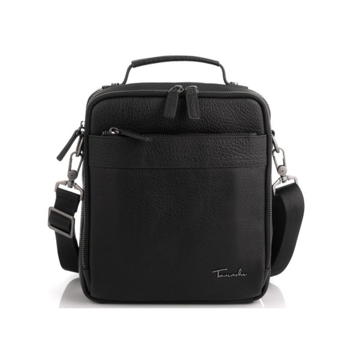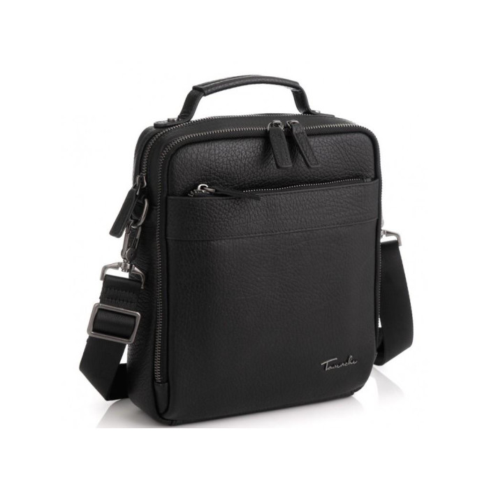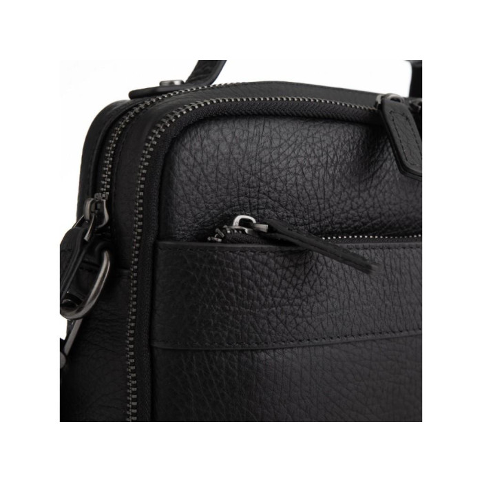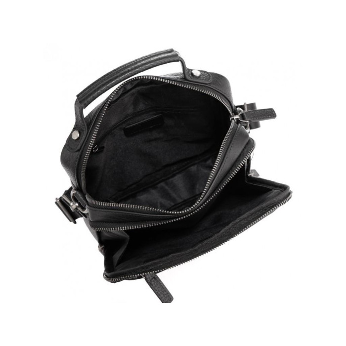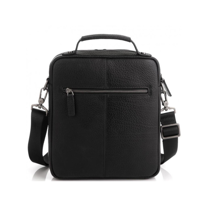 Класична шкіряна чорна чоловіча сумка з італійської шкіри. Для носіння передбачена шкіряна ручка, а також плечовий текстильний ремінь, який можна в будь-який момент зняти. Пуллера - шкіряні, підкладка - чорна, щільна. Чоловіча сумка має одне основне відділення, З лицьового боку кишеня трохи менша за основне відділення, а також кишеня на блискавці горизонтального типу. З тильного боку кишеня на блискавці. Усередині сумки дві маленькі кишені відкритого типу, а також кишеня на блискавці для дрібниць.