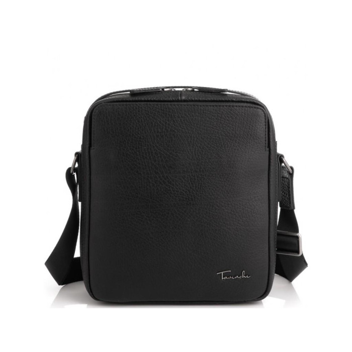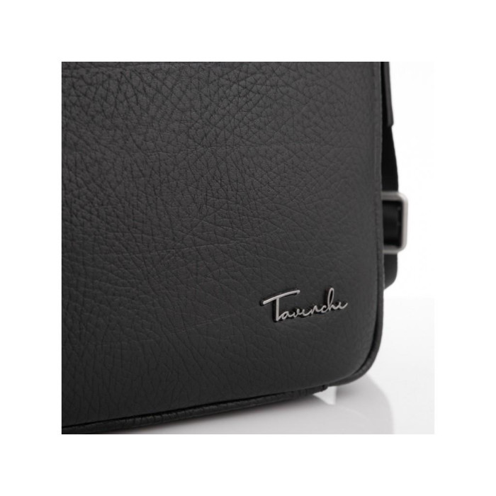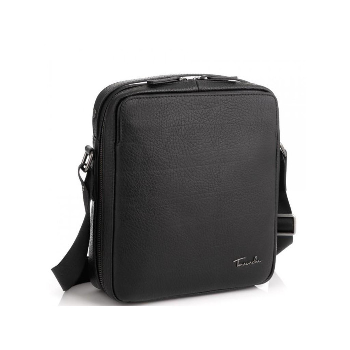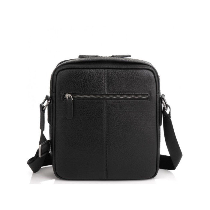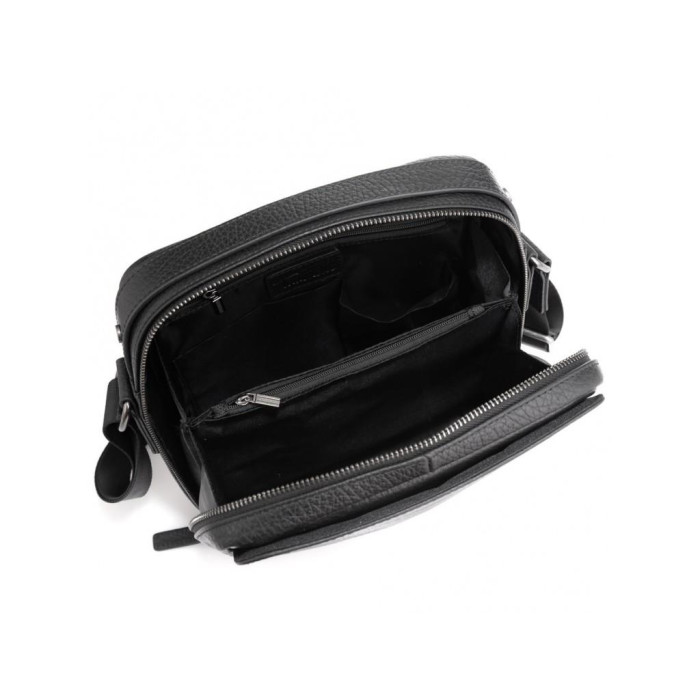 Класична чорна шкіряна сумка з італійської шкіри. Має крупно-зернисту текстуру. Пуллера в сумці шкіряні, для носіння є шкіряна ручка і плечовий текстильний ремінь. Сумка шкіряна оснащена одним великим основним відділенням, яке розділене кишенею-перегородкою на блискавці, також всередині відділення є дві кишені відкритого типу і одна кишеня на блискавці. З лицьового боку є кишеня відкритого типу на двох потайних магнітах, з тильного боку кишеня на блискавці.