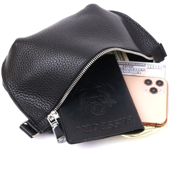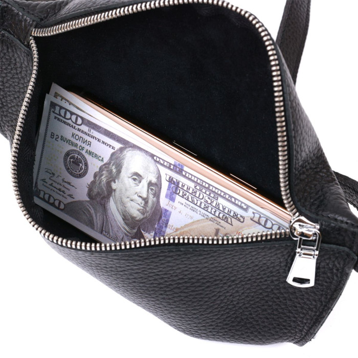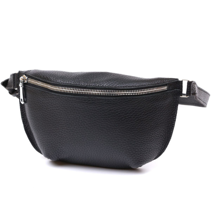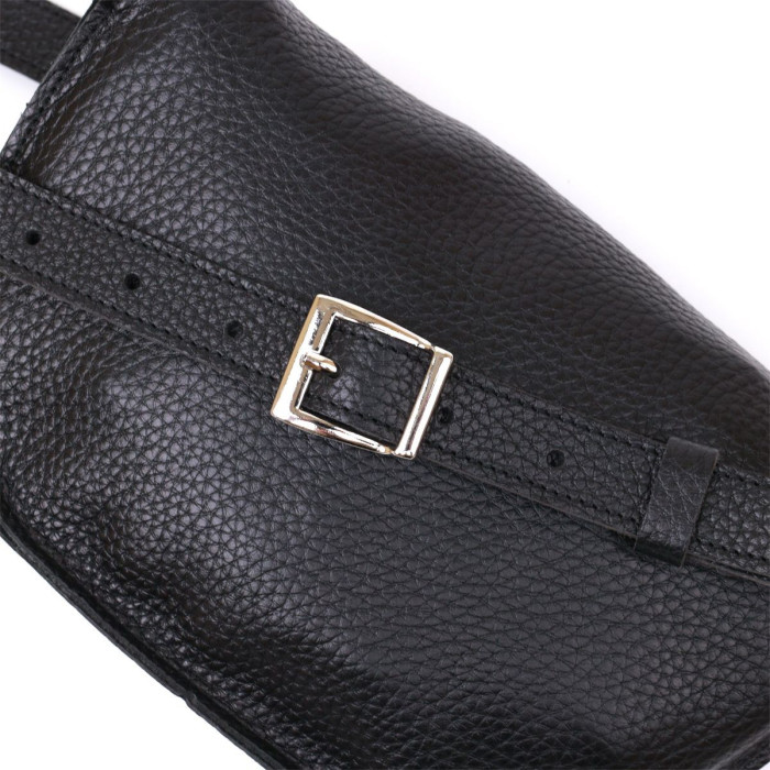 Чудова жіноча сумка на пояс у строгому та лаконічному дизайні. Виконано цю модель з натуральної шкіри, висока якість якої видно навіть неозброєним оком. Колір виробу - універсальний чорний, що практично, фактура - м'яка зерниста. Для зручності передбачена можливість відрегулювати пояс згідно Вашої фігури.