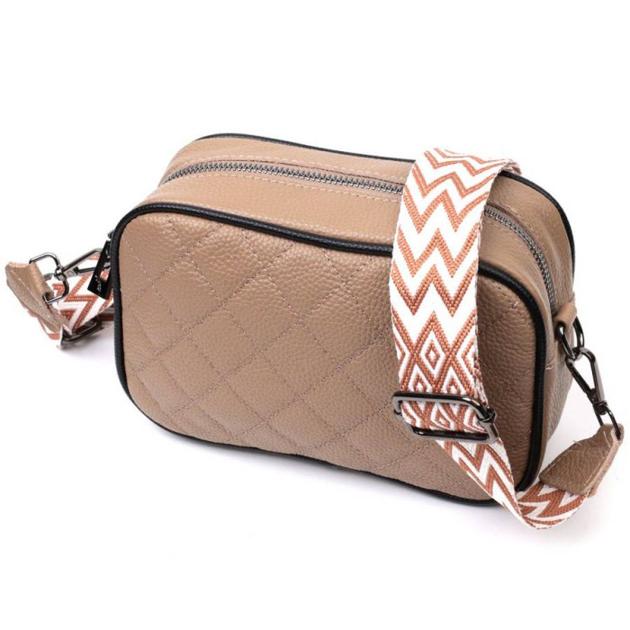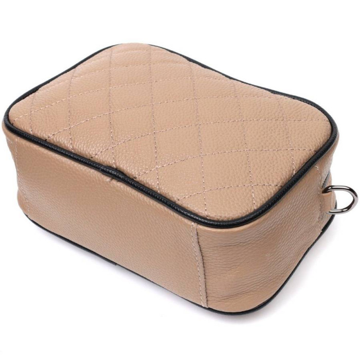 Стьобана ромбами на лицьовій стороні сумка для жінок. Виріб пошитий з якісної натуральної шкіри, яка довго носиться і не втрачає свого первісного вигляду. Аксесуар складається з одного основного відділення всередині якого розташована кишеня відкритого типу і кишеня на блискавці, також зовні розташована кишеня на блискавці, на тильній стороні. Носити сумку можна в руці як клатч, на плечі та через плече, для цього є текстильний ремінь, що знімається. У виробі використано якісну фурнітуру кольору темного срібла. Універсальний варіант сумки як на вечір так і як сумочка на кожен день.