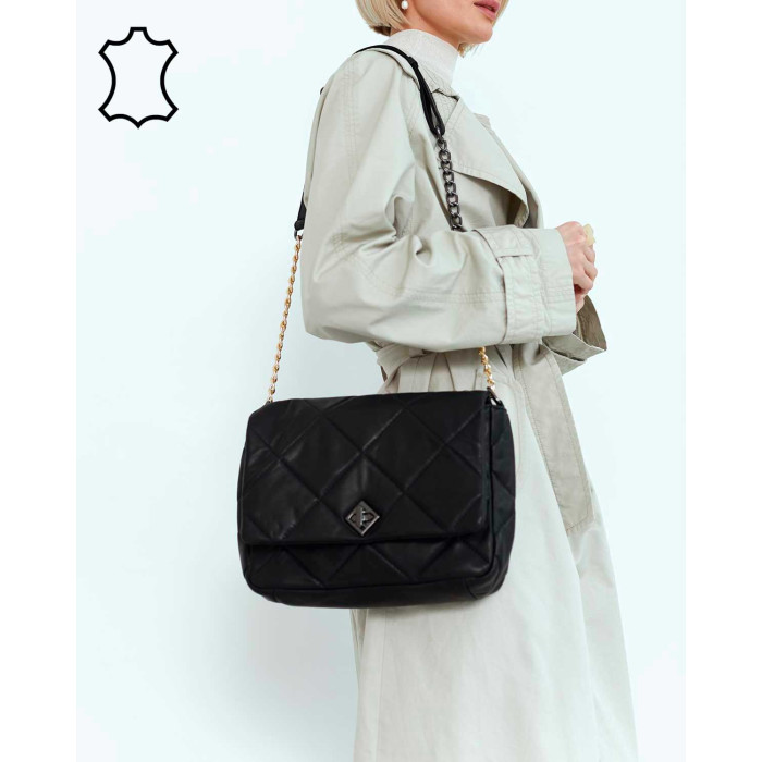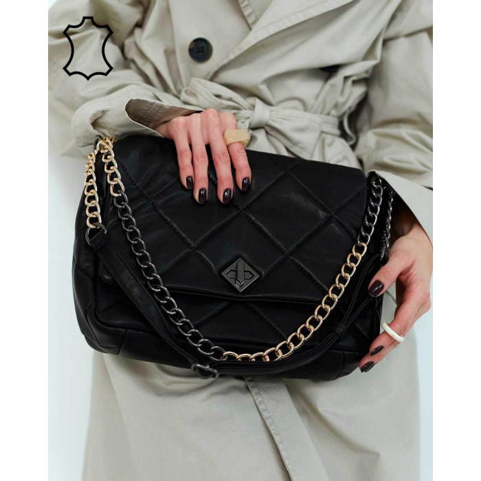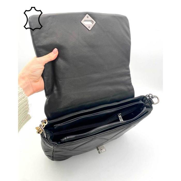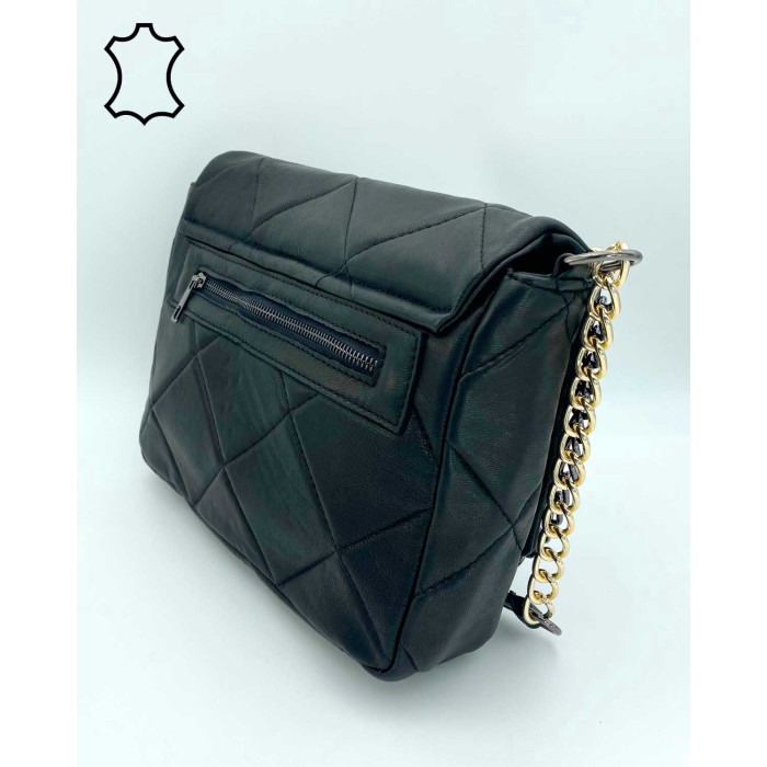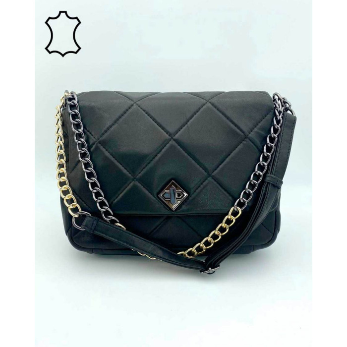 Шкіряна сумка жіноча стьобана K6654 від українського виробника WeLassie, з натуральної овечої шкіри. Сумка відкривається за допомогою замку і блискавки. Всередині сумка на щільній підкладці. Вшита посередині косметичка ділить сумку на дві частини. Також має дві кишені: на блискавці і відкрита. Ручка сумки прикрашена ланцюжком різного кольору, що надає сумці свою унікальність і неповторність. Плечовий ремінь регулюється під різну довжину, максимальна довжина 135 см.