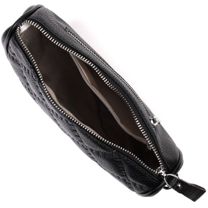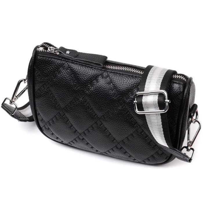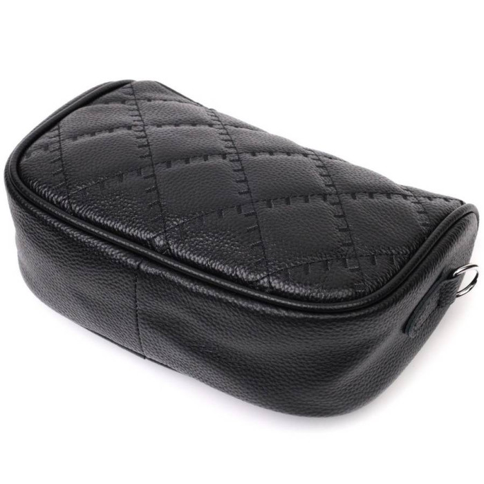 Напівкругла жіноча стьобана сумка з якісної натуральної шкіри, яка довго носиться і не втрачає свого первісного вигляду. Аксесуар складається з одного основного відділення, всередині якого розташована кишеня відкритого типу та кишеня на блискавці, а також кишеня на блискавці зовні, на тильній стороні. Носити сумку можна в руці як клатч, на плечі та через плече, для цього є текстильний ремінь, що знімається. У виробі використано якісну фурнітуру срібного кольору.