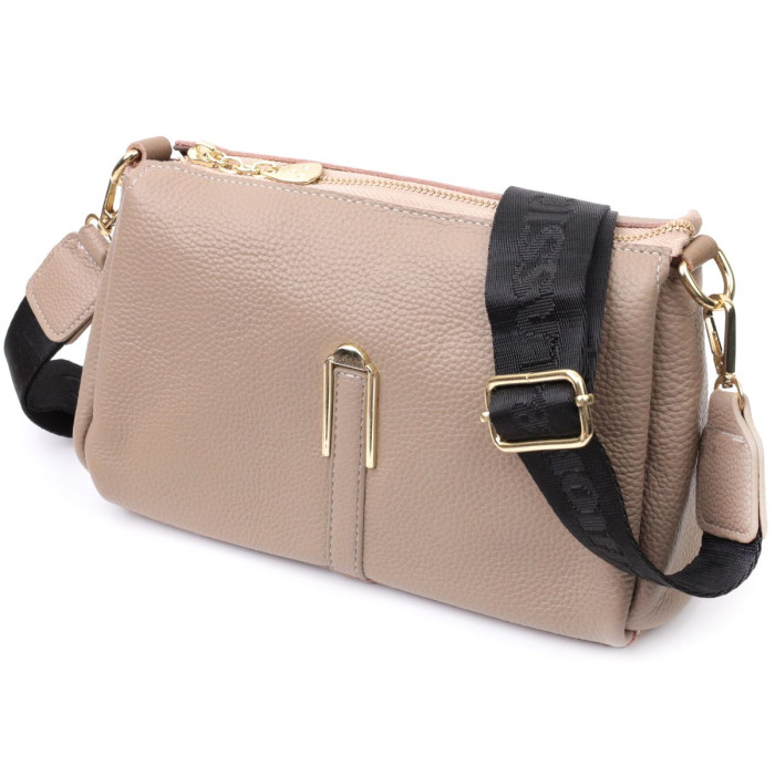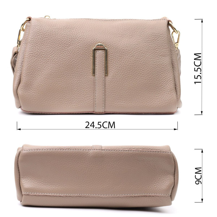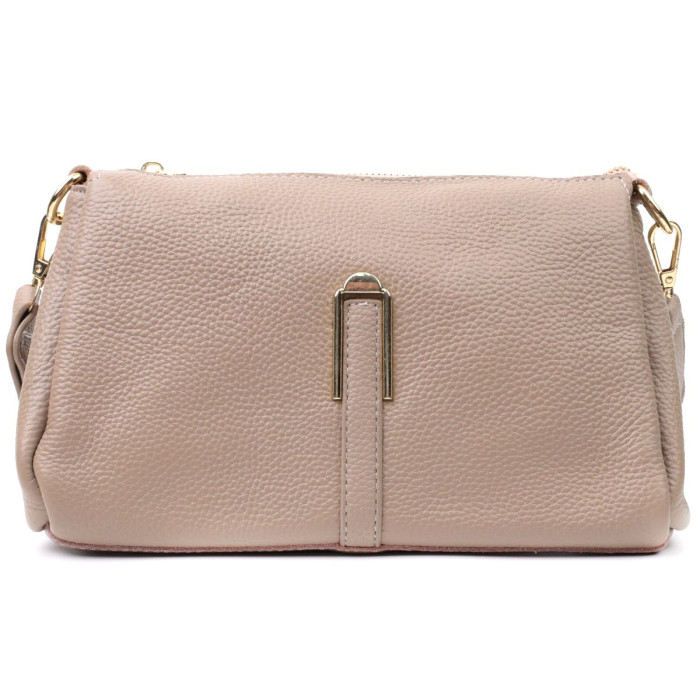 Жіноча сумка на всі випадки життя із натуральної якісної шкіри. Аксесуар складається з основного відділення, яке закривається на блискавку, кишені на блискавці та трьох кишень відкритого типу всередині, а також кишені на блискавці зовні на задній стороні. Носити сумку можна в руці, під рукою, на плечі і через плече, для цього є три ремінці різної довжини, два шкіряні та один текстильний. В аксесуарі використано якісну фурнітуру кольору жовтого золота.