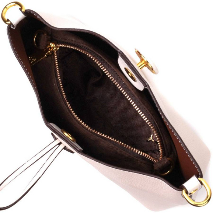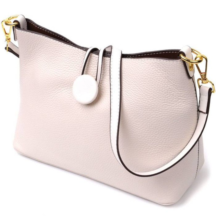Якісна жіноча сумка без підкладки, з твердим дном і знімною тканинною косметичкою всередині - не залишить байдужою жодну жінку. Виріб пошитий з якісної натуральної шкіри, яка довго носиться і не втрачає свого первісного вигляду. Аксесуар складається з одного основного відділення, всередині якого розташована знімна тканинна косметичка. Носити сумку можна в руці, на плечі та через плече, для цього є шкіряний та текстильний ремені, що знімаються. У виробі використано якісну фурнітуру кольору жовтого золота. Універсальний варіант сумки як на вечір так і як сумочка на кожен день.