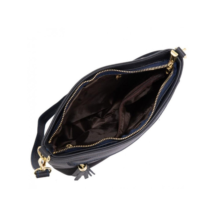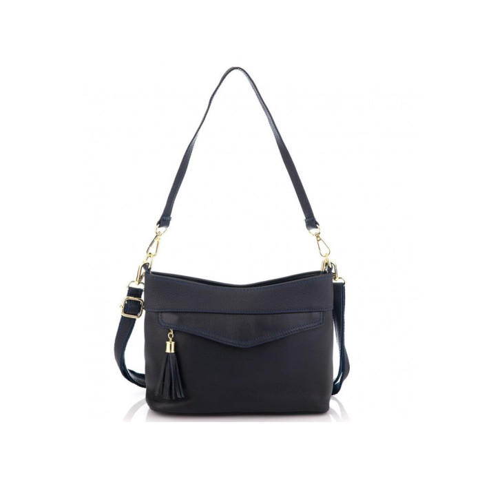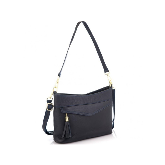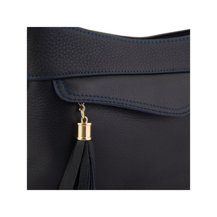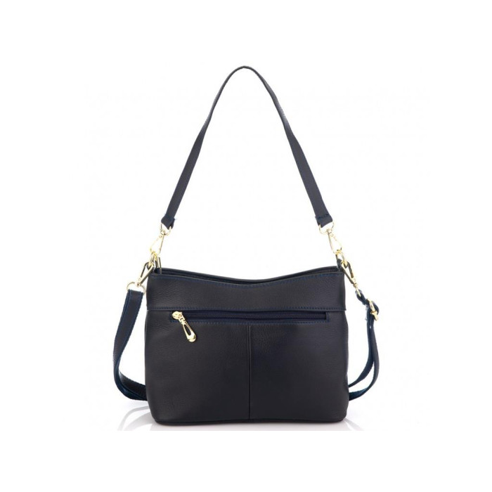 Синя шкіряна сумка із зернистою текстурою. Жіноча сумка має класичний дизайн. Золота фурнітура, плечовий ремінь, який регулюється по довжині та додаткова ручка для носіння (50 см), робить сумку ще більш привабливою. Вона має одне основне відділення на молнії, всередині якого є дві кишені на молнії та карман відкритого типу для дрібниць. З лицевої сторони є карман на блискавці під маленьким клапаном, з тильної сторони також кишеня на блискавці.