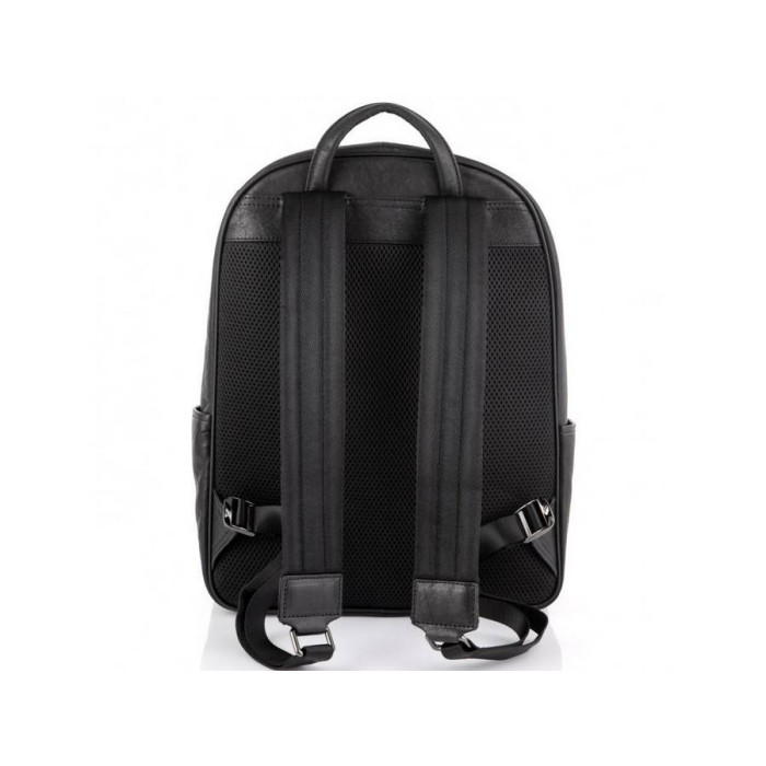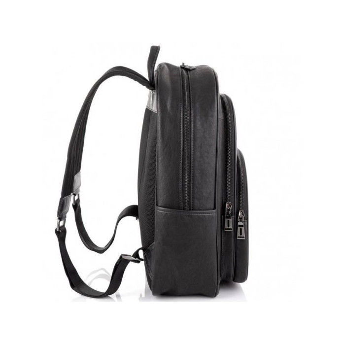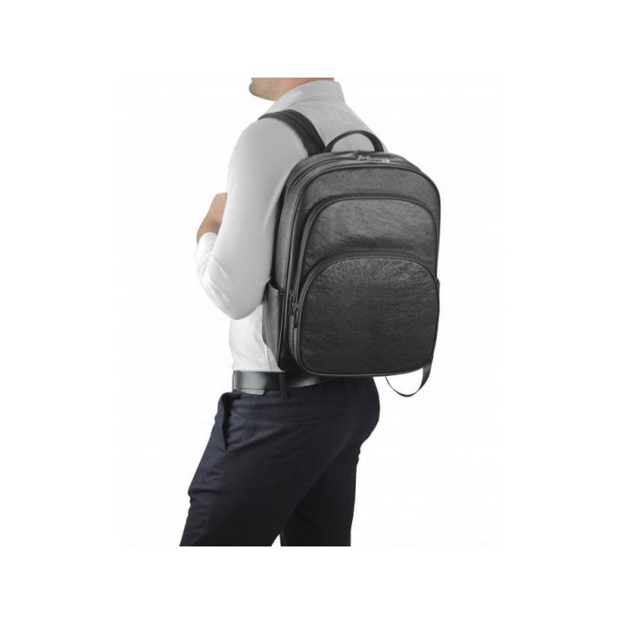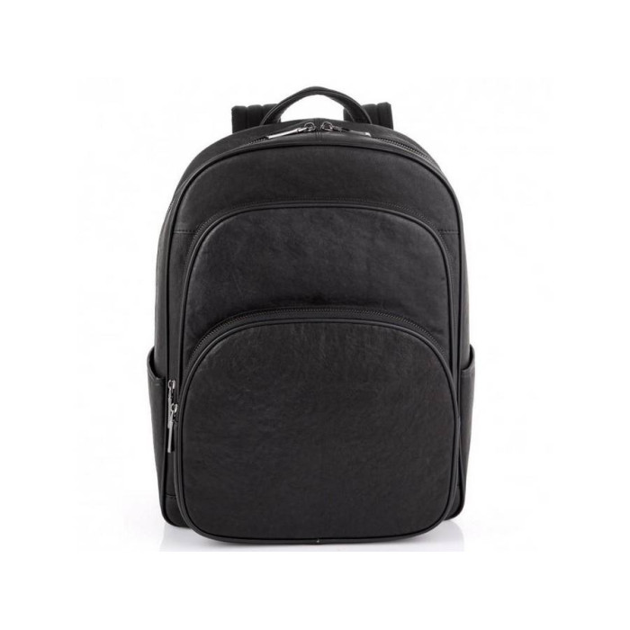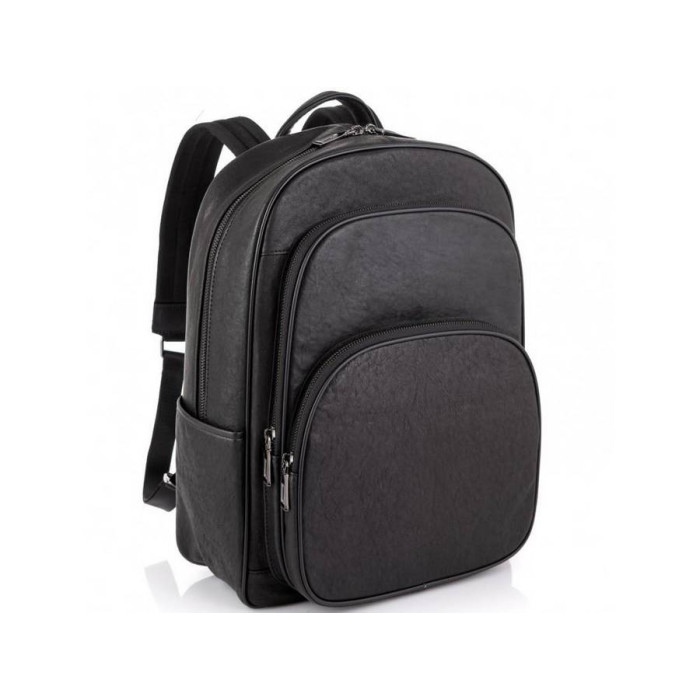 Великий чорний шкіряний рюкзак з текстурної шкіри. Рюкзак має щільні текстильні шлейки, спинка рюкзака зроблена з дихаючої сіточки. Фурнітура надійна, срібляста. Чоловічий рюкзак має три відділення на блискавці, одне з них велике, в ньому є додаткова кишеня для гаджета відкритого типу, дві маленьких кишені відкритого типу для дрібниць і кишеня на блискавці. З боків рюкзака є дві кишені відкритого типу.