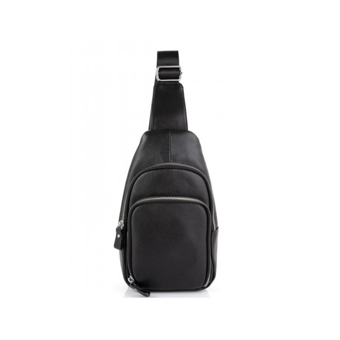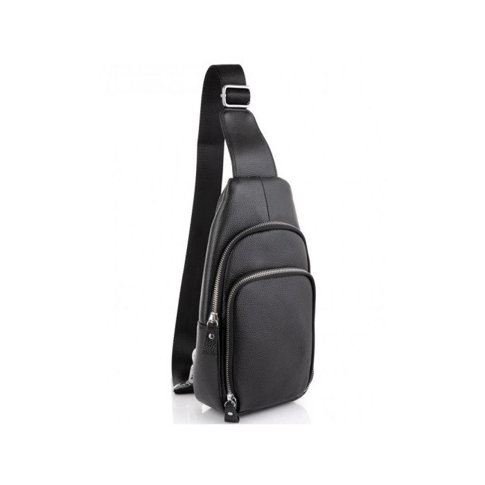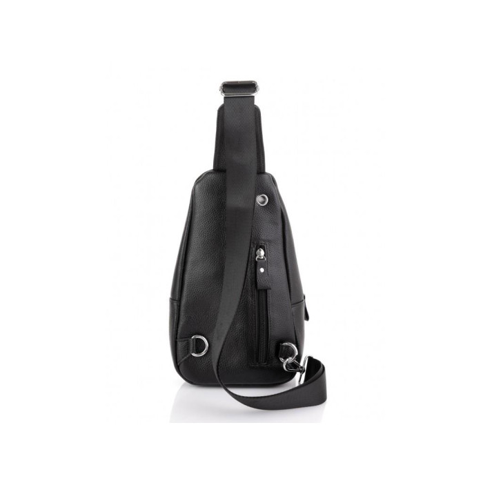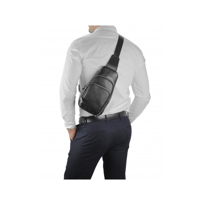 Компактний чорний слінг через плече. Наплечний текстильний ремінь можна перестібати за допомогою карабіна на ліву або на праву сторону. Фурнітура сумки-слінгу срібна. Сумку можна носити на спині або на грудях. Вона має два відділення з лицьового боку на блискавці і одну кишеню вертикального типу з тильного боку. Усередині сумки є одне основне відділення на блискавці і маленька кишеня відкритого типу.