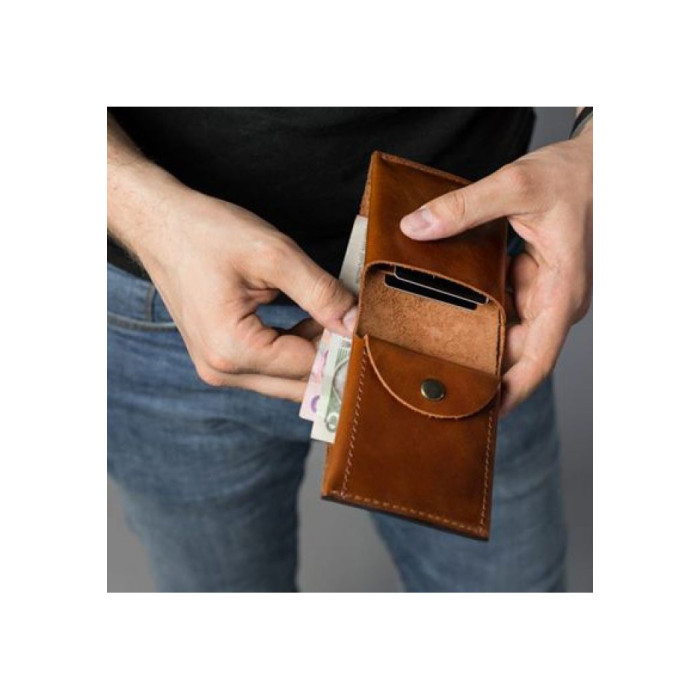 Матеріал: шкіра Розмір: в закритому вигляді 9х12 см Всередині: - одне відділення для грошей - 2 просторих кишені-мішка з відділеннями для карт - монетниця