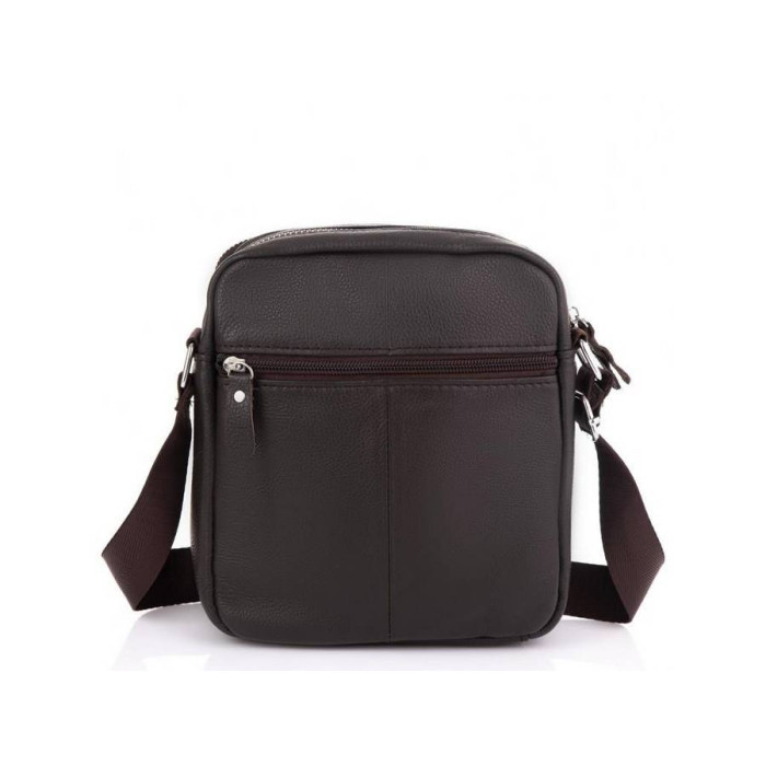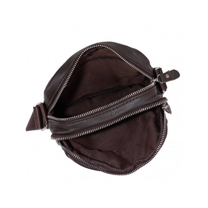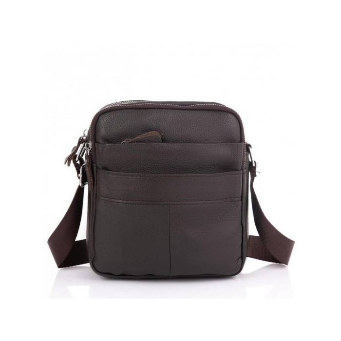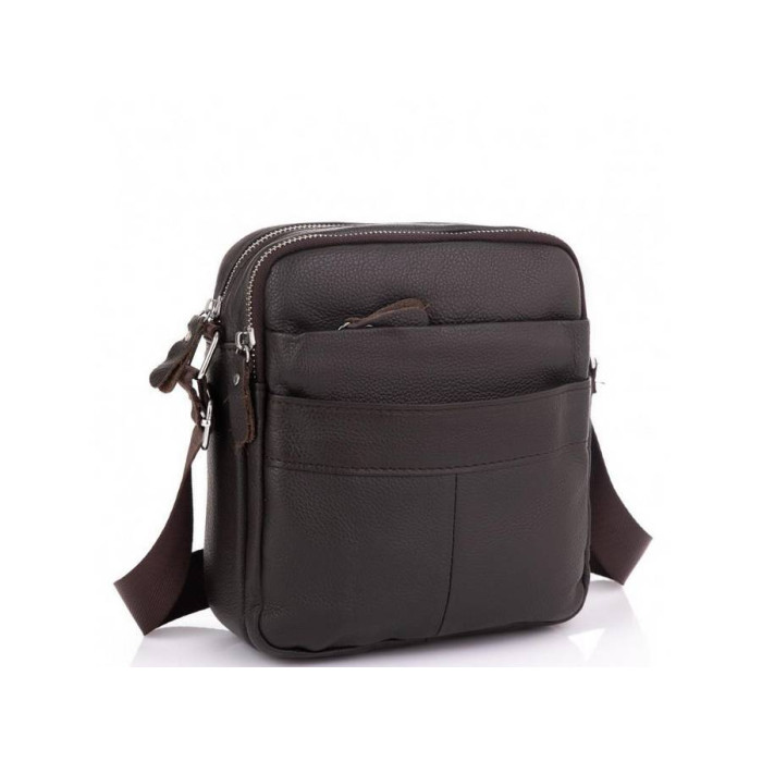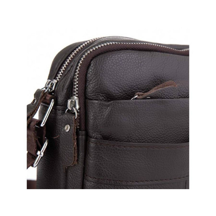 Чоловіча сумка коричневого кольору з натуральної шкіри із застосуванням надійної металевої фурнітури. Сумка має компактні розміри. Структура шкіри - зерниста. Маленька чоловіча сумка оснащена двома основними відділеннями, що дозволяє розділити предмети для зручного зберігання. З лицьового боку розташована кишеня, а також маленька кишеня з тильного боку. Усередині сумки є одна маленька кишеня для дрібниць.
