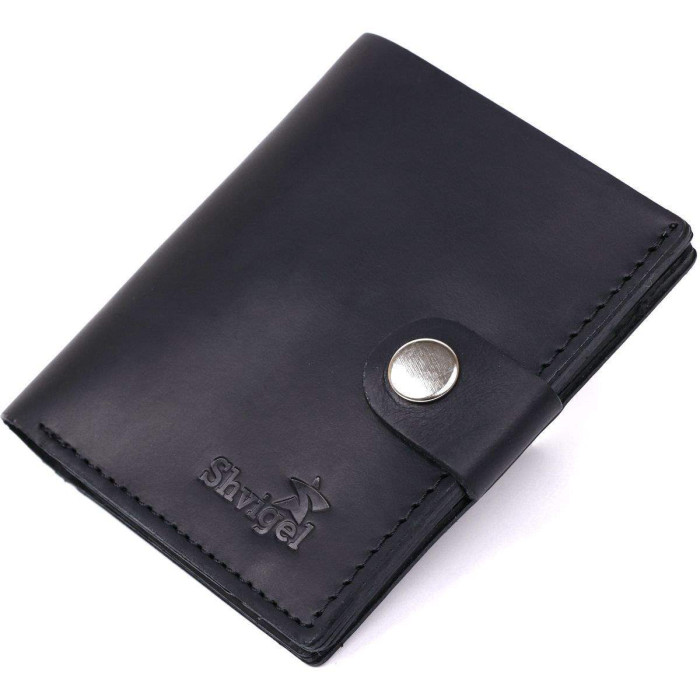 Компактний чоловічий гаманець із натуральної шкіри високої якості від українського виробника. Має універсальний чорний колір та матову гладку фактуру, яка дуже приємна на дотик. Внутрішнє наповнення представлене у вигляді відділення для купюр, кредитних карток та монетниці на кнопці.