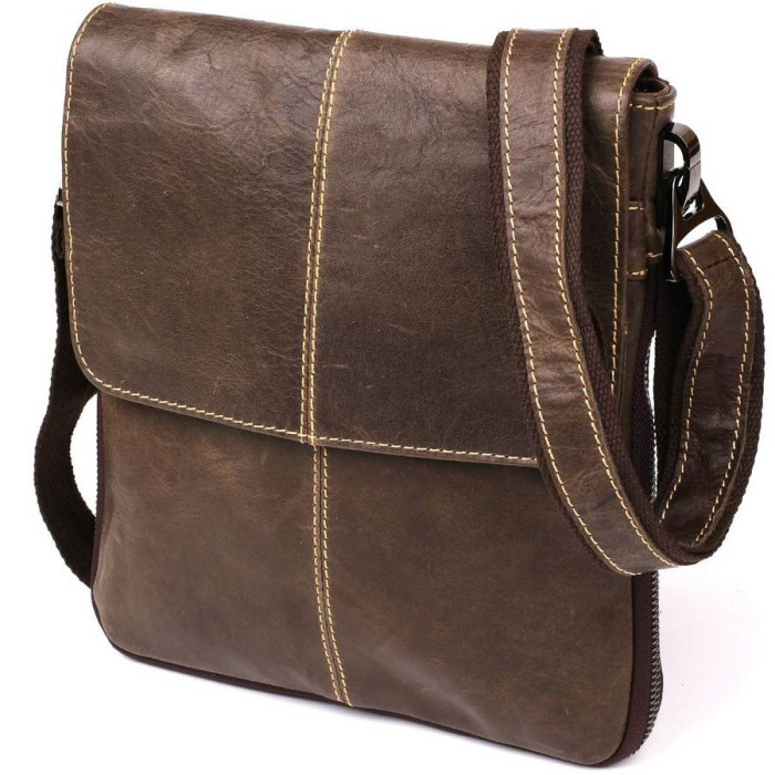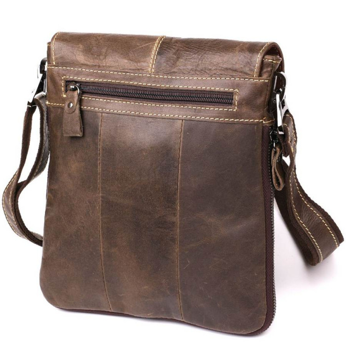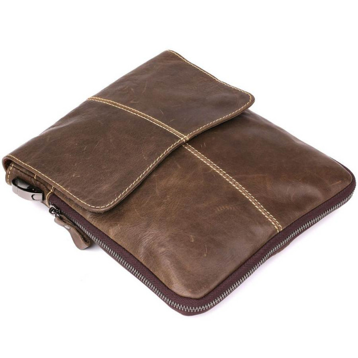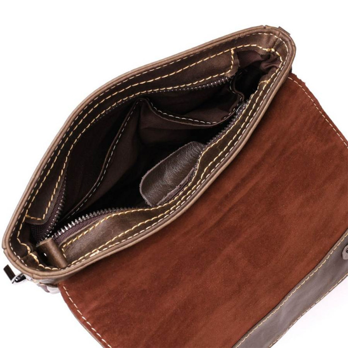 Оригінальна сумка з натуральної шкіри коричневого кольору. Її особливістю є те, що ви можете самостійно регулювати її обсяг за допомогою блискавки знизу аксесуару. Сумка доповнена якісною фурнітурою в дизайн виробу кольору темного срібла. Сумка має невеликий розмір і досить містка. Усередині аксесуару якісна текстильна підкладка коричневого кольору. По краях сумка прошита рівною світлої ниткою. Ідеальний варіант для повсякденного використання. Сумка відмінно підійде вам для роботи або навчання. Аксесуар упакований в тканинний мішок для захисту від пилу і бруду, в той час як ви її не носите. Буде бажаним подарунком для близької людини.