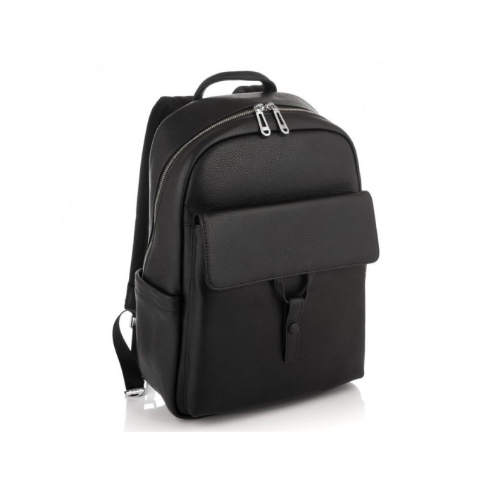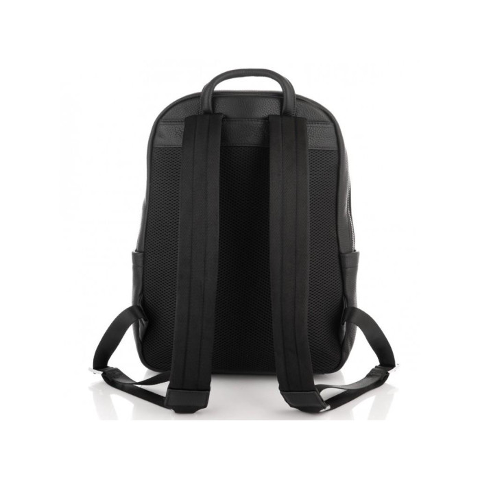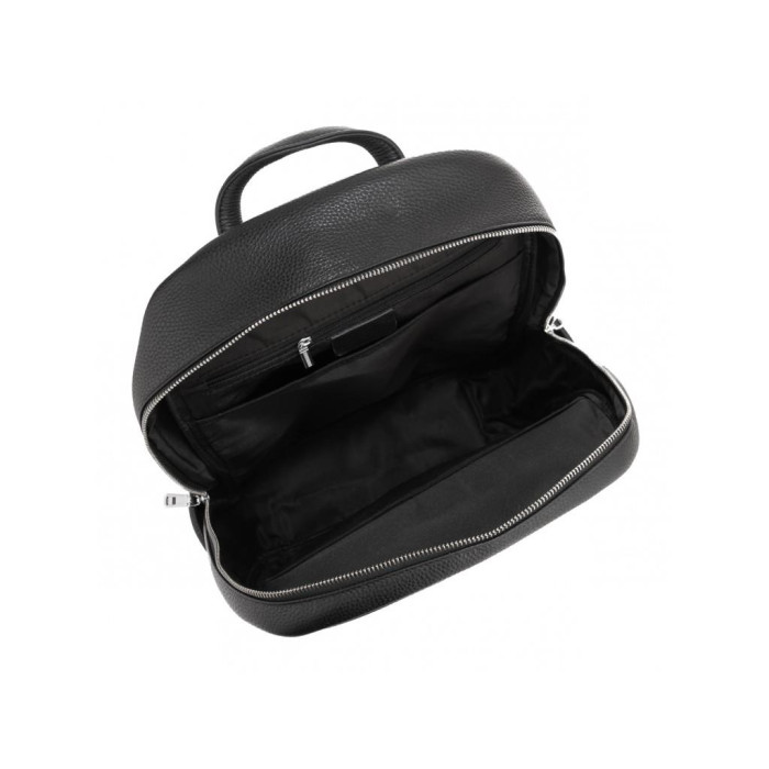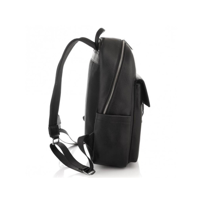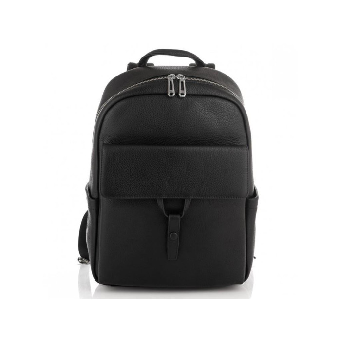 Великий чорний шкіряний рюкзак виконаний в зернистої натуральної шкіри. Рюкзак має щільні текстильні шлейки, спинка рюкзака зроблена з м'якої сіточки, що робить його дуже зручним для довгих прогулянок. Фурнітура надійна, срібляста. Чоловік рюкзак має одне основне відділення на блискавці, в якому є два великих кишені відкритого типу і кишеню на блискавки. З боків рюкзака є дві кишені відкритого типу, з лицьового боку-велика кишеня на клапані.