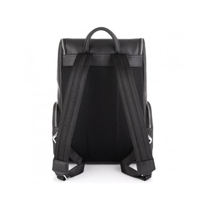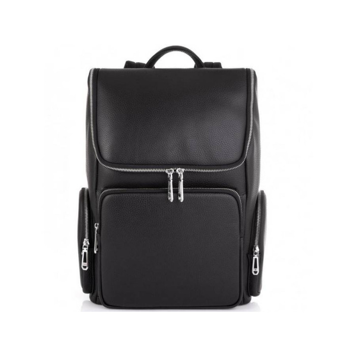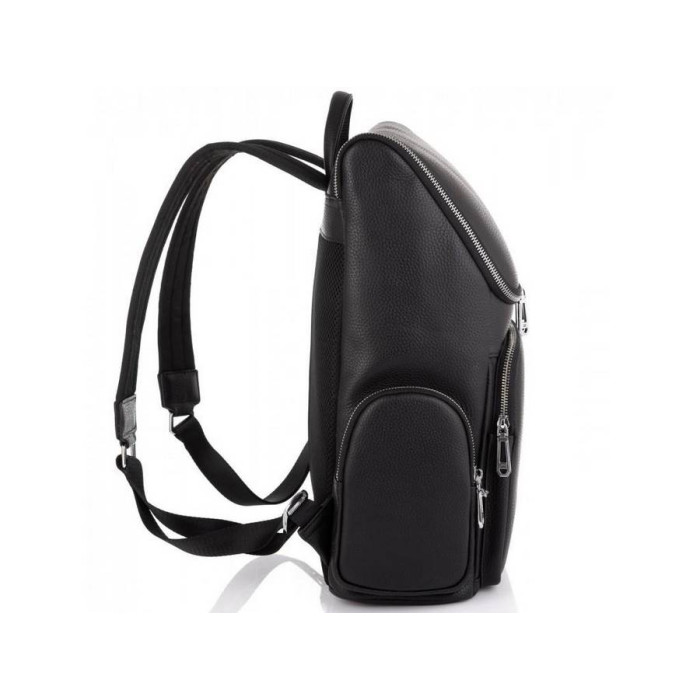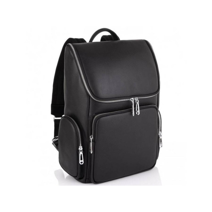 Стильний шкіряний рюкзак в чорному кольорі. Він прекрасно тримає форму, виглядає дуже стильно і акуратно. Плечові лямки щільні текстильні, спинка зроблена з дихаючої сіточки. Фурнітура надійна срібляста. Рюкзак має одне велике основне відділення, всередині якого є дві кишені відкритого типу для гаджетів, а також кишеня на замку. З лицьового боку також є додаткова кишеня на блискавці і ще дві кишені з боків рюкзака також на блискавці.