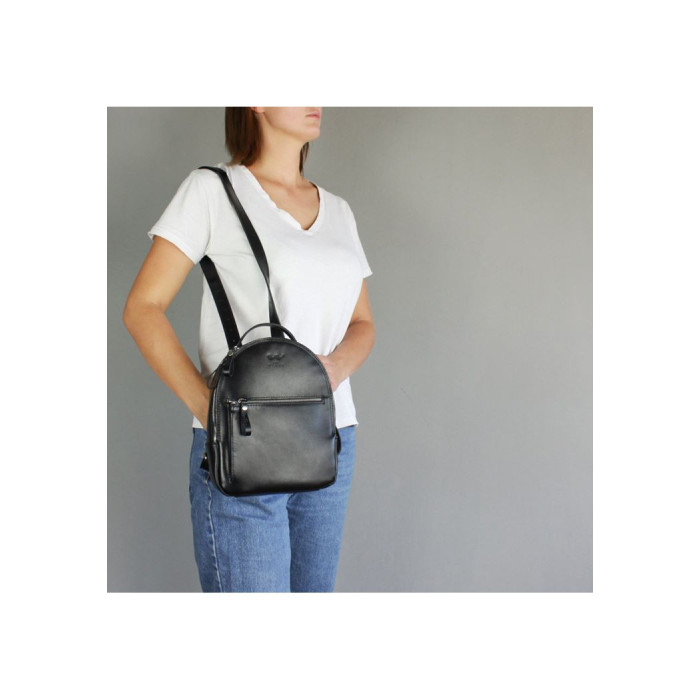 Розмір: 26/21/10 см Матеріал: шкіра, тканинна підкладка Застегивается на блискавку Оснащений: - одним відділенням - одним великим кишенею без застібки - одним на блискавки - зовнішніми кишенями на блискавці на задній і передній стінках Трансформується в сумку Фурнітура: металева (колір : антик або нікель), пластикова блискавка YKK