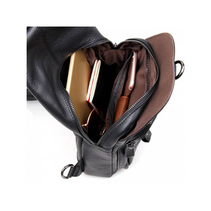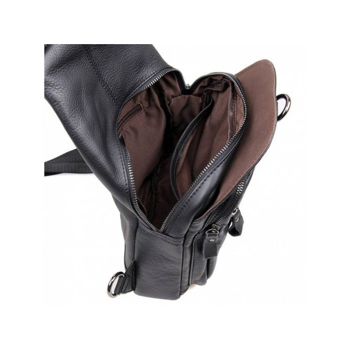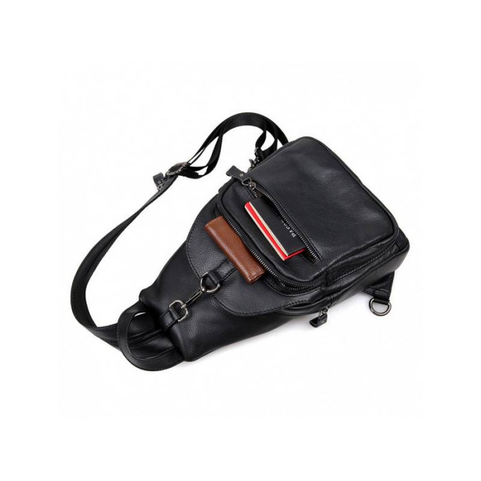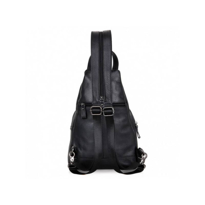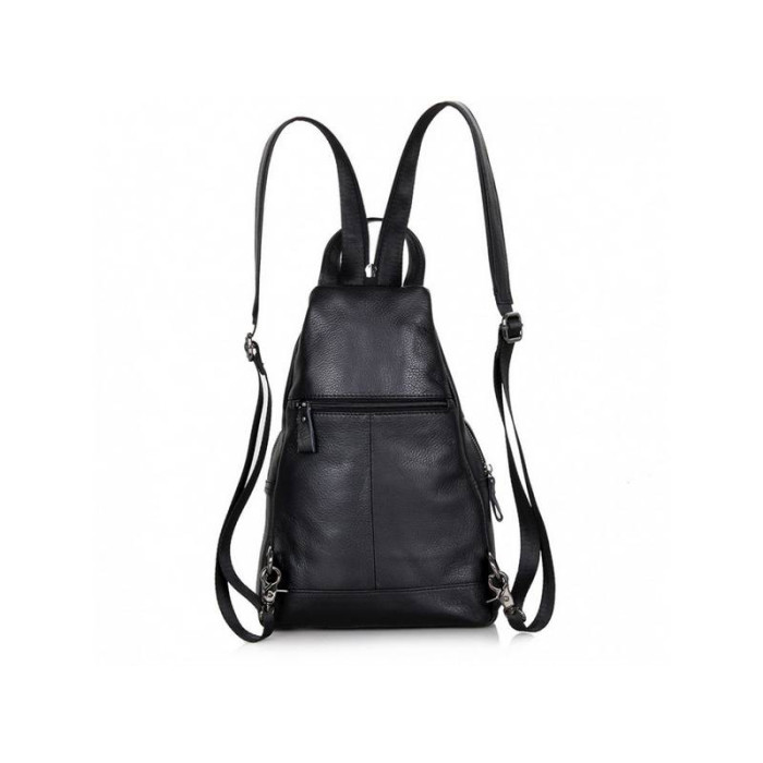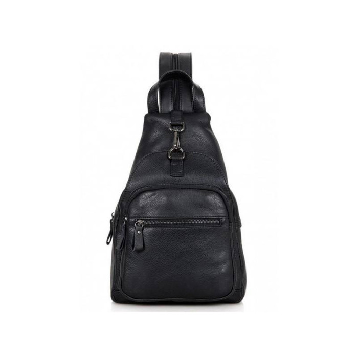 Рюкзак от Tiding Bag разроблений для повсякденного користування. Подібний аксесуар може підкреслити характер творчих людей, але також підходить під стиль одягу casual. Матеріал виготовлення – чорна теляча шкіра з гладкою поверхнею. Зовні для особистих речей передбачені три кишені, два на блискавці та один на застібці. Основой відділ закривається на металеву змійку. У него поміститься блокнот, планшет, портмоне та інші особисті речі.