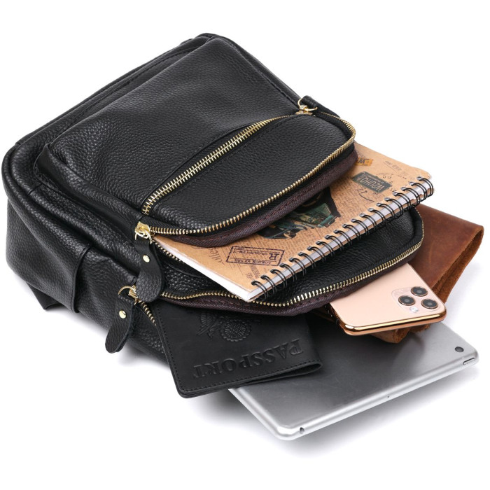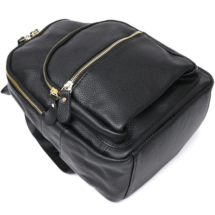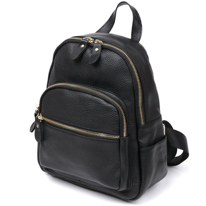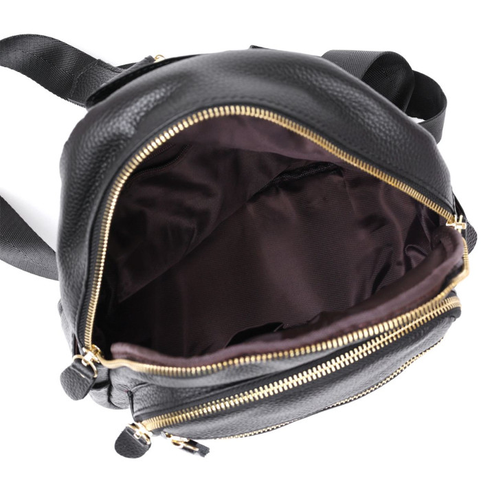Симпатичний компактний жіночий рюкзак із натуральної шкіри високої якості. Має містке основне відділення та додаткові кишені на зовнішній стороні, що дуже зручно та практично. Фактура виробу – зерниста, колір – універсальний чорний, фурнітура зроблена під золото. Такий рюкзак стане чудовим подарунком близькій людині на будь-яке свято.