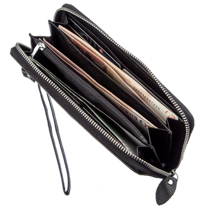 Шикарний клатч для неповторних жінок в діловому стилі. Має гарний і строгий дизайн. Виготовлений з натуральної шкіри з відмінними зносостійкими характеристиками і властивостями. Колір виробу насичено чорний, що надає аксесуару універсальність і можливість носити його при будь-якому гардеробі господині. Клатч легко поміститися в дамську сумочку, завдяки своїм невеликим розмірам. А також його можна носити як окремий аксесуар на зап'ясті за допомогою спеціального ремінця, який йде в комплекті. Такий виріб стане незабутнім придбанням або подарунком близькій людині. Упакований гаманець-клатч в картонну фірмову коробку.