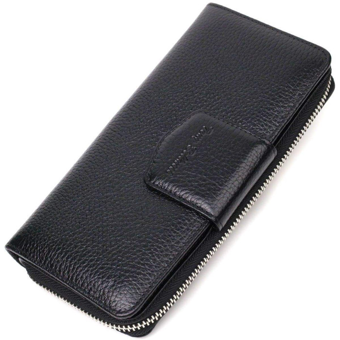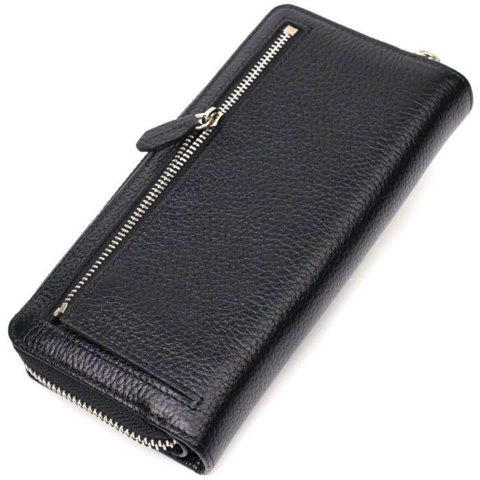 Місткий жіночий гаманець з натуральної шкіри флотар, для якої характерна міцність, зносостійкість та зерниста фактура. Аксесуар складається з одного місткого основного відділення з кишенею-перегородкою на блискавці, монетниці, тринадцяти осередків для пластикових карток, двох прилеглих кишень та трьох відділень під сіточкою для документів. У виробі використано якісну фурнітуру сріблястого кольору. Закривається гаманець на блискавку – основне відділення, та на хлястик з кнопкою – блок для карт. Купуючи шкіряний гаманець собі або на подарунок усі хочуть отримати якісну та стильну річ, саме такі вироби представлені у нашому магазині, а наші досвідчені менеджери допоможуть визначитися з вибором.