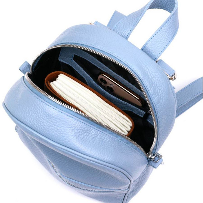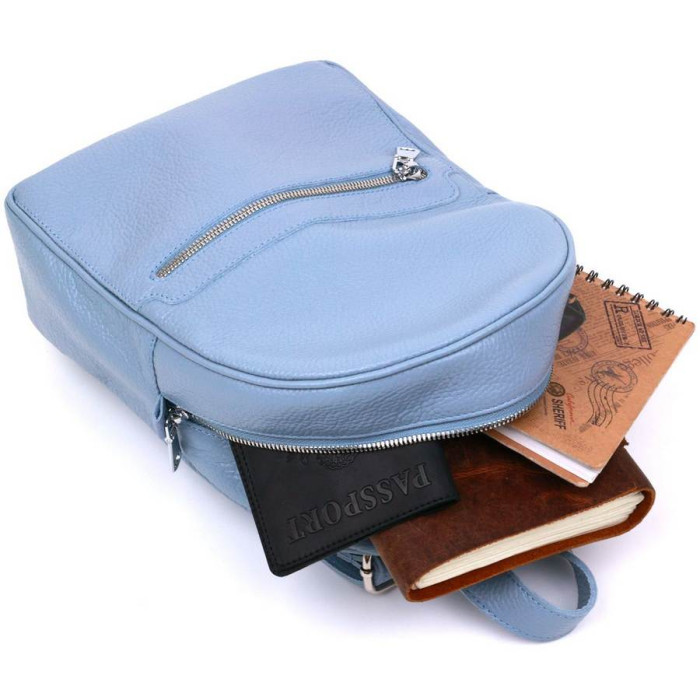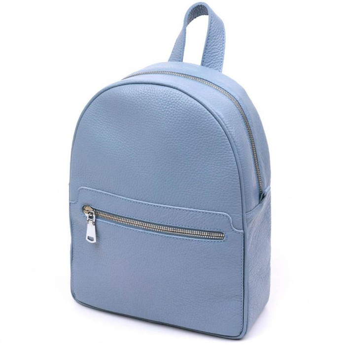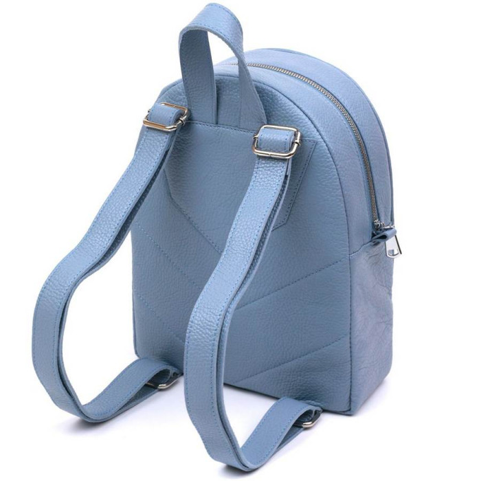 Компактний жіночий рюкзак від українського виробника для поціновувачів простого та акуратного дизайну без надмірностей. Матеріал виготовлення – натуральна шкіра високої якості з відмінними характеристиками. Колір виробу – блідо-блакитний, що виглядає красиво та по-літньому свіжо, фактура – зерниста. Шлейки регулюються по довжині та виконані також з натуральної шкіри.
