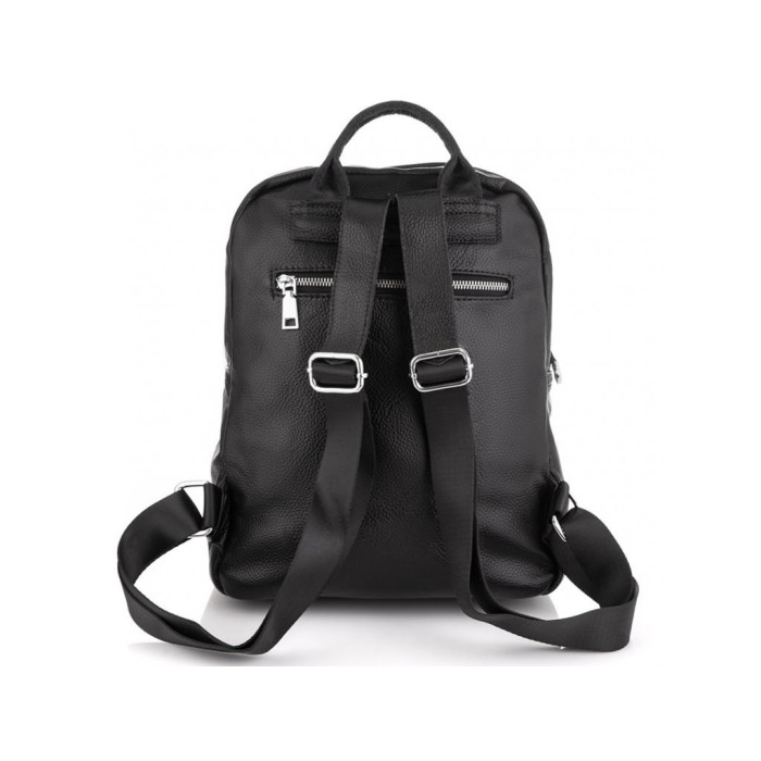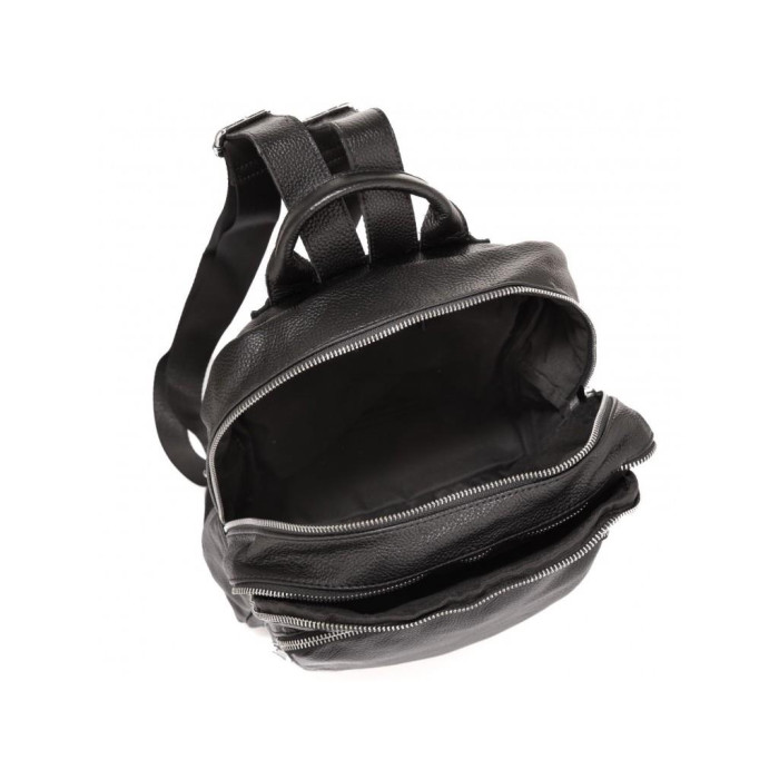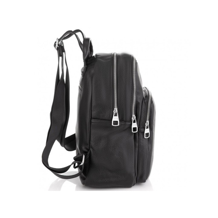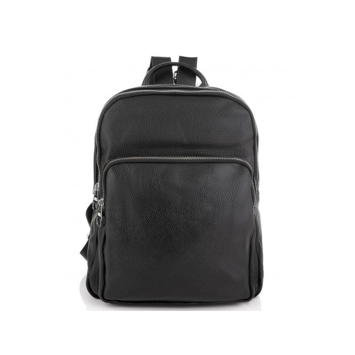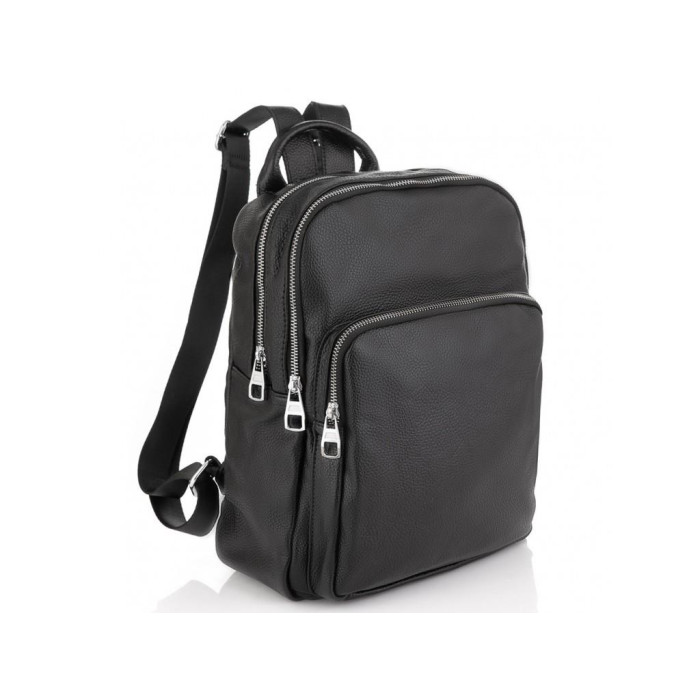 Шкіряний рюкзак жіночий в чорному кольорі з зернистої шкіри. Рюкзак має сріблясту фурнітуру, шкіряну ручку для зручної носки, а також текстильні наплічні шлейки. Є два основних відділення, одне велике, інше поменше. З лицьового боку розташована накладна кишеня на блискавці, з тильного боку також є кишеня на блискавці. Усередині основного великого відділення є маленька кишеня для дрібниць.