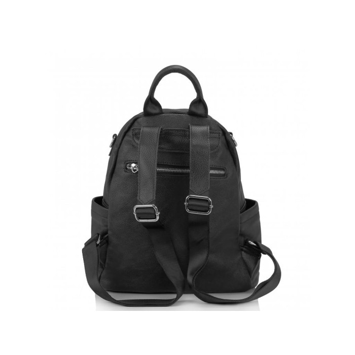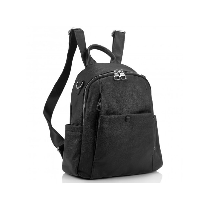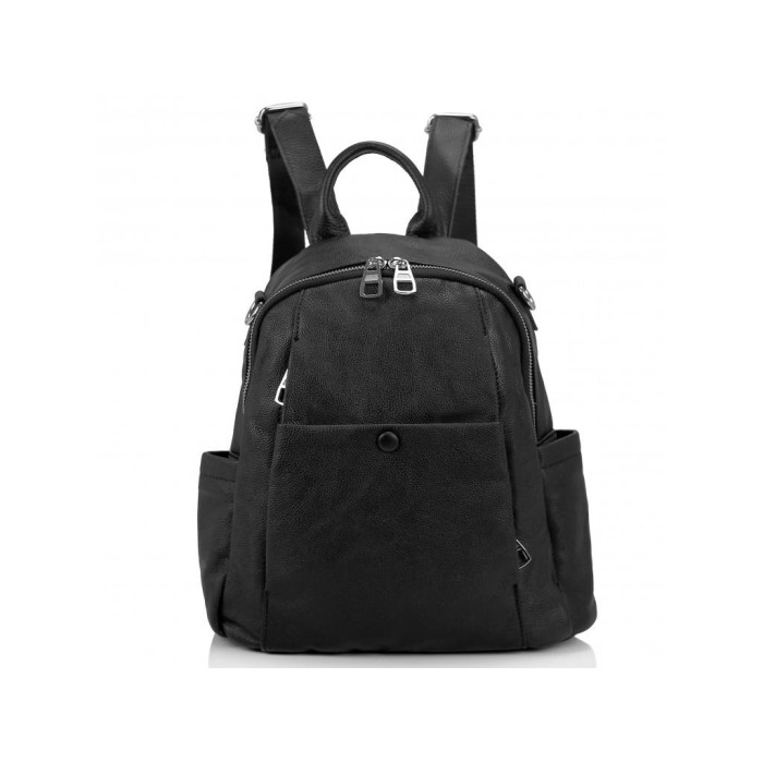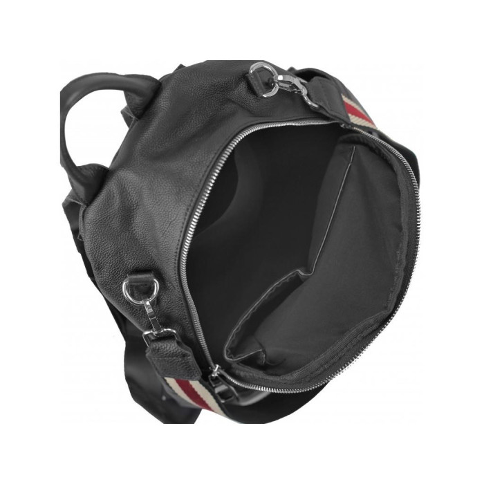 Шкіряний жіночий рюкзак в зернистої шкірі. Рюкзак має надійну фурнітуру темне-срібло. Для носіння можна використовувати наплічні шлейки, шкіряну ручку або текстильний плечовий ремінь. Рюкзак має одне основне відділення на блискавці всередині якого є дві кишені відкритого типу, а також дві кишені на блискавці. З лицьового боку розміщений накладна кишеня на блискавки. Зверху все відділи накриваються клапаном на магнітній кнопці. З тильного боку розташована кишеня на блискавці.