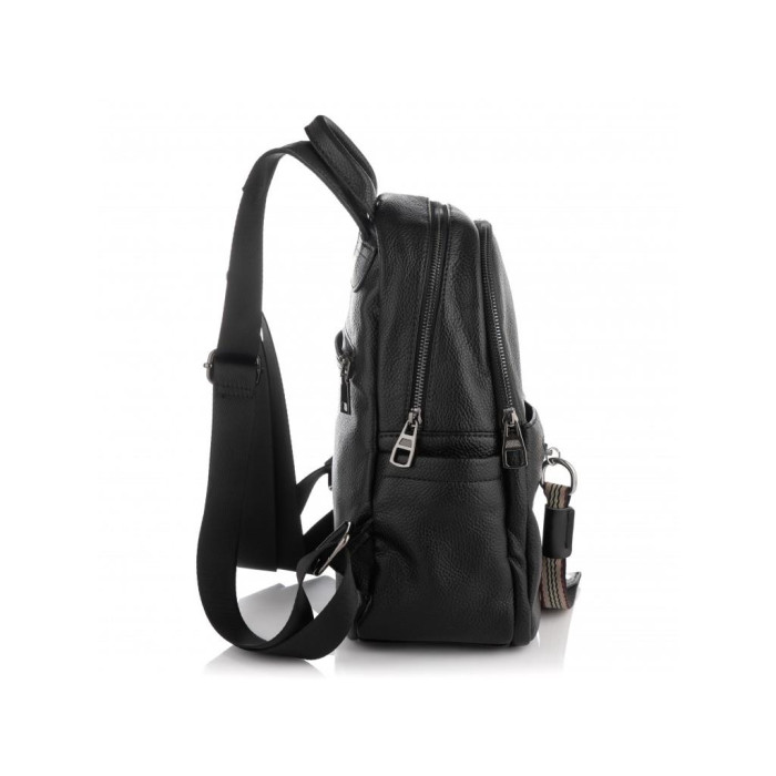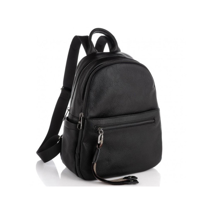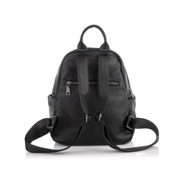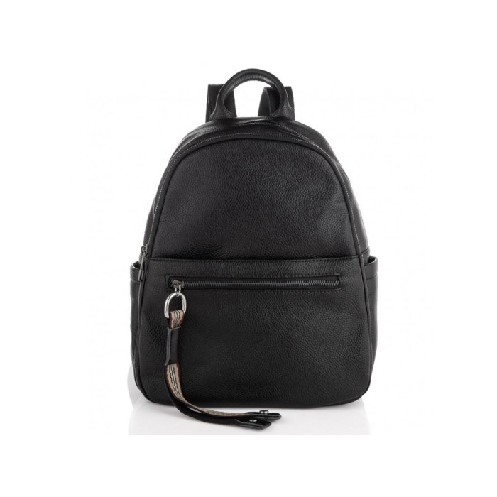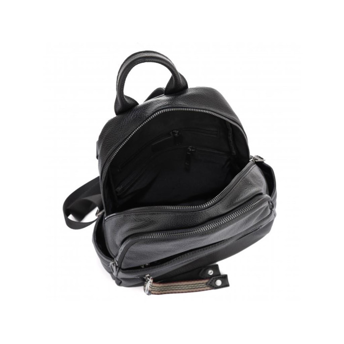 Жіночий шкіряний рюкзак в зернистої шкірі. Для носіння можна використовувати плечові шлейки, а також шкіряну ручку. Рюкзак має два основних відділення на блискавці, одна велика всередині якого є дві кишені відкритого типу і дві кишені на блискавці. З лицьового боку розташований додаткова кишеня на блискавці, з тильної також є кишеня горизонтального типу. З боків рюкзака дві маленькі кишені відкритого типу.
