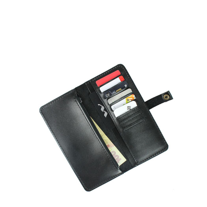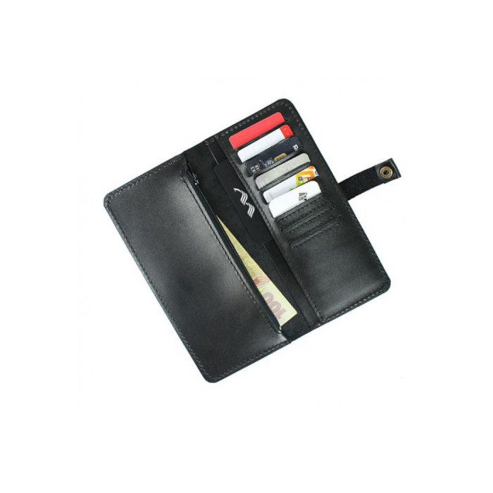 Розмір: 9х20 см в закритому вигляді Матеріал: шкіра Застегивается на кнопку Всередині: - 8 відділень для карток - 3 великих відділення для купюр - 1 відділення на блискавці для дрібниці Фурнітура: металева, колір нікель або антик