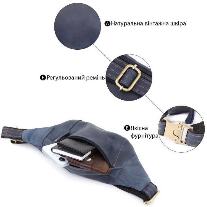 Сумка-бананка Shvigel із натуральної шкіри у стильному синьому кольорі – вибір для динамічних та впевнених. Ця компактна сумка-бананка від українського бренду Shvigel виконана з натуральної шкіри насиченого синього кольору, що надає аксесуару свіжості та оригінальності. Це не просто сумка - це зручне та стильне рішення для активного способу життя. Сумка-бананка ідеально підходить для міста, прогулянок, поїздок та подорожей, коли важливо тримати все необхідне під рукою і при цьому не перевантажувати образ.