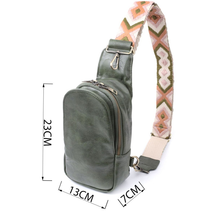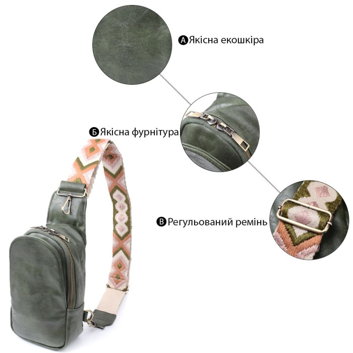 Компактна жіноча сумка через плече на кожен день з якісної екошкіри, яка є альтернативою натуральній шкірі. Дана модель складається з одного основного відділення, яке закривається на блискавку і в якому знаходяться три кишені для кредитних карток усередині, а також однієї потайної кишені на лицьовій стороні, що закривається на карабін. Акцентом даної моделі є зручний регульований плечовий ремінець у етнічному стилі, що дуже модно вже кілька сезонів. Екошкіра - високоякісна альтернатива натуральному матеріалу, яка дуже стійка до тертя, до низьких температур, відмінно носиться на відміну від інших штучних матеріалів, а також має гіпоалергенний склад на відміну від натуральної шкіри. Мода не стоїть на місці, на зміну класичним сумкам приходять нові моделі, які обумовлені сучасним часом, саме такою є слінг сумка - зручна, практична, невелика, але містка і головне якісна.
