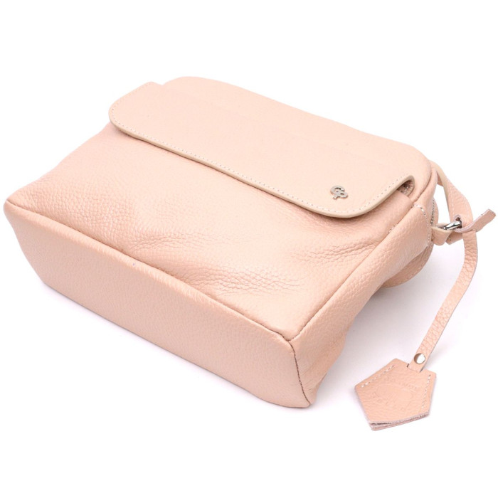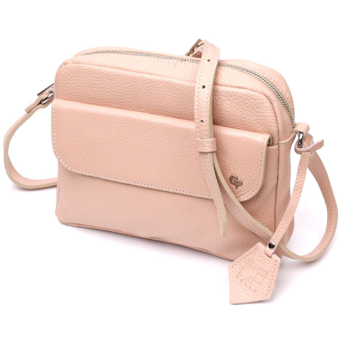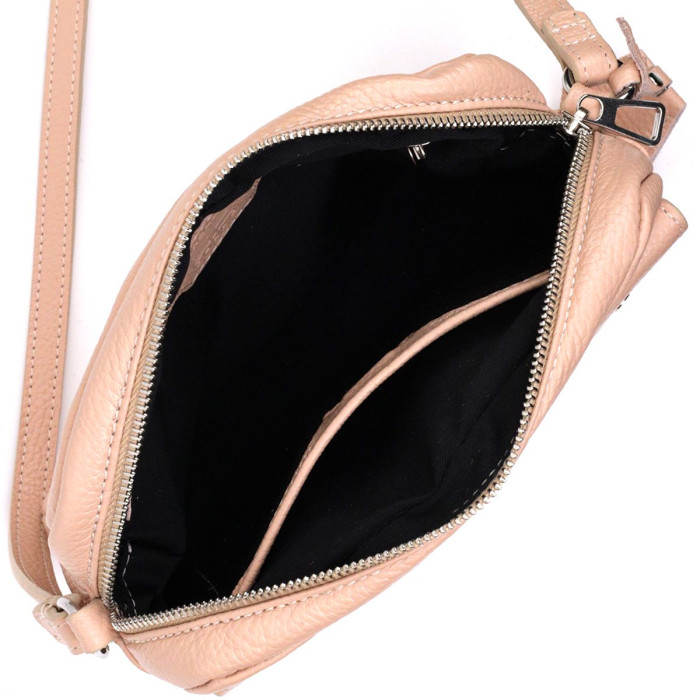 Цікава жіноча сумка через плече – хіт сезону. Аксесуар складається з основного відділення, що закривається на блискавку, кишені відкритого типу та кишені на блискавці всередині, зовнішньої кишені на блискавці, на тильній стороні та накладної кишені на лицьовій стороні, що закривається клапаном на магніти. Виконана з міцної та зносостійкої натуральної шкіри. Фурнітура срібного кольору, регульований шкіряний плечовий ремінь. Упакована ця сумка в гарний фірмовий чохол із ручками.