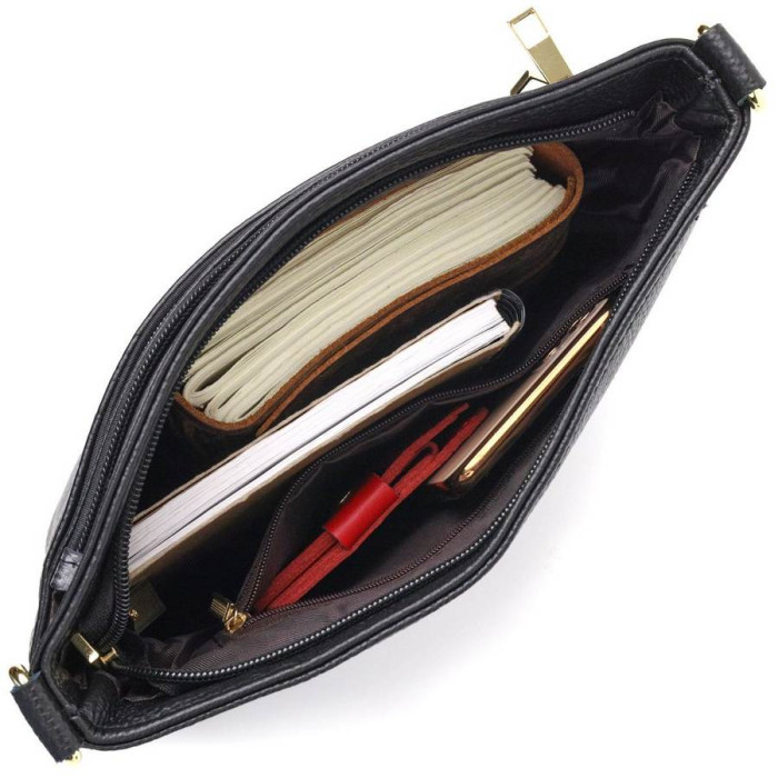 Стильна сумка жіноча середнього розміру з натуральної високоміцної шкіри з квітковим тисненням. Має класичний чорний колір та зернисту фактуру. Фурнітура виконана у кольорі під золото. Модель довгий час залишається у ідеальному стані, таку сумку приємно носити. Може бути чудовим варіантом для подарунка близькій людині.