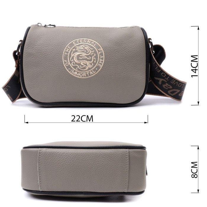Стильна жіноча сумка з вишивкою по центру з натуральної якісної шкіри. Аксесуар складається з основного відділення, яке закривається на блискавку, потайної кишені на блискавці та кишені відкритого типу всередині, а також кишені на блискавці зовні на тильній стороні. Носити сумку можна в руці, під рукою, на плечі та через плече, для цього є не знімний текстильний ремінь. В аксесуарі використано якісну фурнітуру кольору срібла.