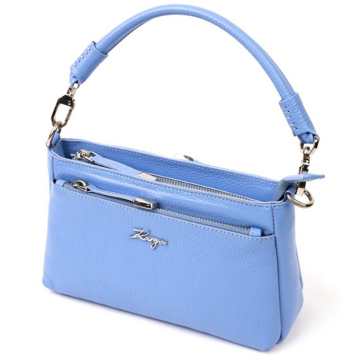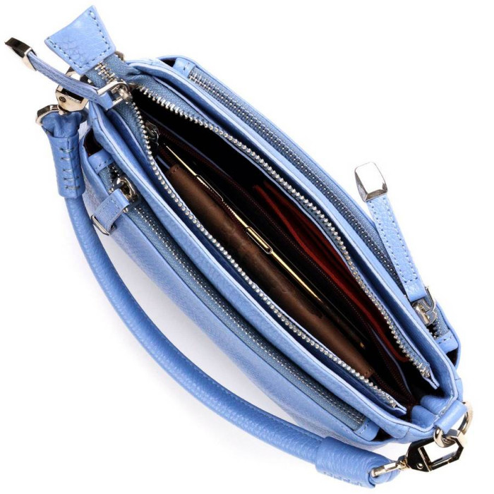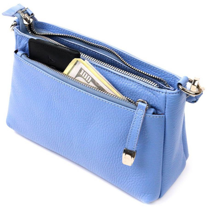 Містка жіноча сумка-клатч з натуральної зернистої шкіри, красивого блакитного кольору. Сумка функціональна та зручна в експлуатації, якісна фурнітура сріблястого кольору відмінно доповнює стильний та непересічний дизайн сумки. Сумка з натуральної шкіри завжди буде чудовим подарунком будь-якій жінці.