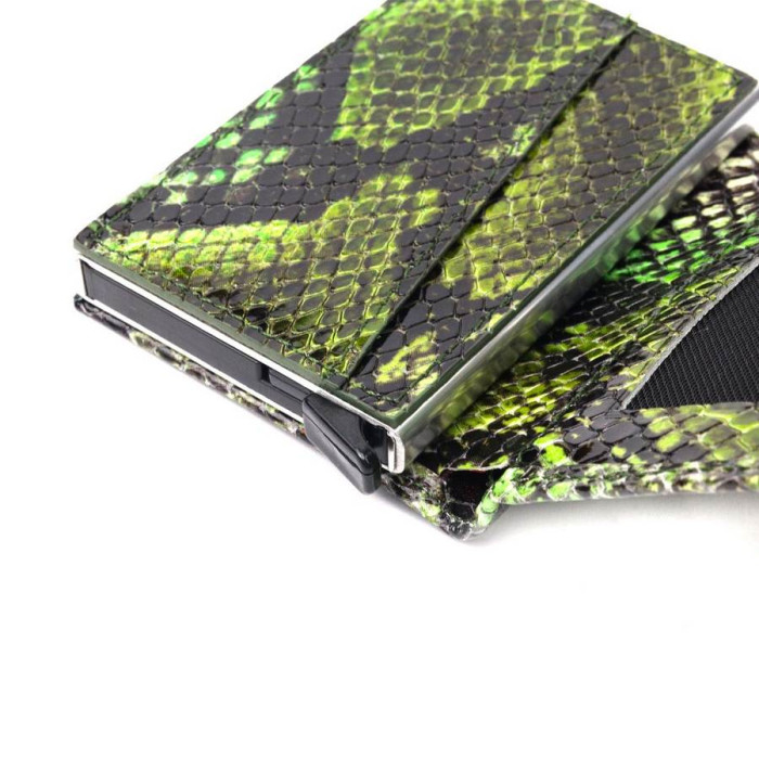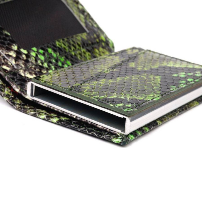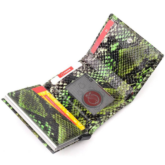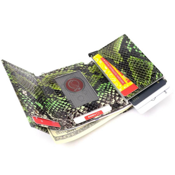 Функціональний картхолдер з лакованої фактурної шкіри, з тисненням під змію, призначений для зберігання банківських та дисконтних карток та невеликої кількості готівки. Має лаконічний дизайн, відмінно лягає в руку, поміщається в кишеню, а також будь-яку сумку. Шкіра м'яка, приємна на дотик. Механізм працює надійно та зручний у використанні; картки добре закріплені в аксесуарі. Відмінна ідея для подарунка близькій людині.
