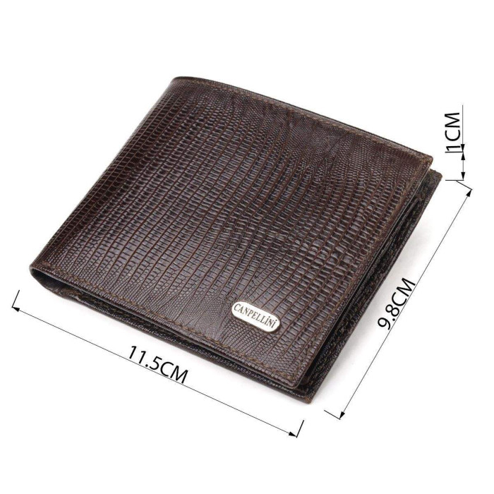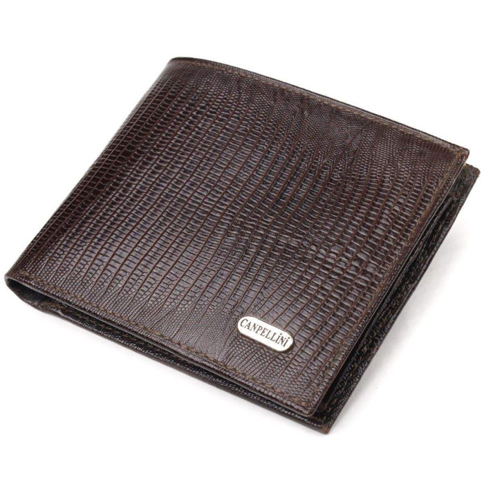 Оригінальний чоловічий гаманець з натуральної шкіри з тисненням під рептилію. Аксесуар має два відділення для купюр, в які містяться купюри всіх номіналів, дві прилеглі кишені, а також тринадцять відсіків для карток, один з них під сіточкою. У сучасному світі шкіряне портмоне є просто необхідною річчю, а якісне шкіряне портмоне є ще й непоганим вкладенням грошей, оскільки прослужить не один рік.