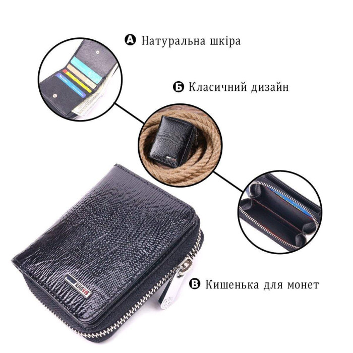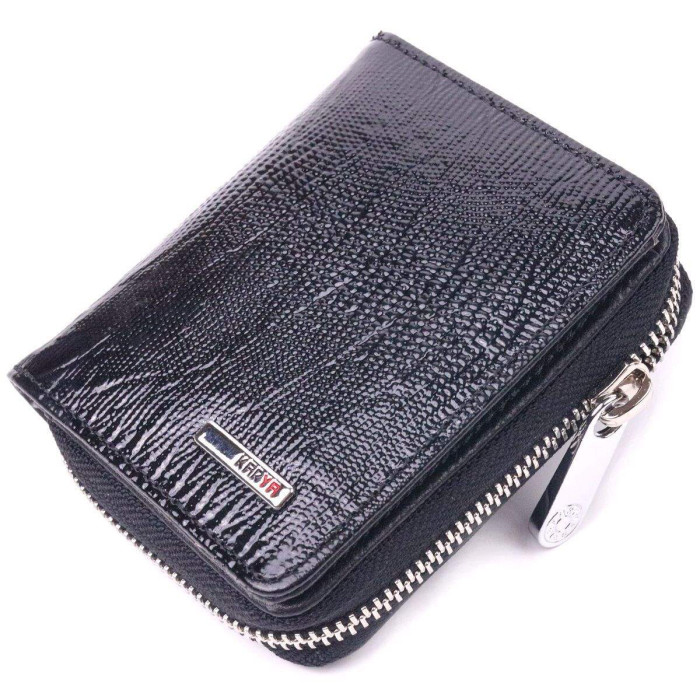 Лакований жіночий гаманець із натуральної фактурної шкіри у класичному чорному кольорі. Виріб складається з одного місткого відділення для купюр, чотирьох прилеглих кишень, чотирьох слотів для карток, та монетниці на блискавці. Складається аксесуар навпіл, з фіксацією кнопку. Якісна фурнітура доповнює та прикрашає виріб. Такий гаманець з натуральної шкіри - це ідеальний варіант на кожен день для тих, хто цінує якість, зручність та комфорт, а також чудово доповнюватиме Ваш повсякденний образ.