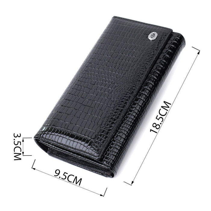 Стильний гаманець для жінок із високоякісної лакованої шкіри із тисненням під рептилію. Має все необхідне, щоб стати Вам незамінним аксесуаром у повсякденному рутинному житті. Ви легко помістите в нього паперові купюри, монети, документи. Фішкою цього гаманця є блок для карт, особливістю якого є наявність двох кнопок, що дозволяє регулювати заповнення блоку. На лицьовій стороні, у правому нижньому кутку розташований металевий логотип виробника, що є запорукою якості виробу. Запакований аксесуар у білу щільну картонну коробку з фірмовим логотипом. Якщо Ви вирішите такий аксесуар подарувати близькій людині, то Вам гарантовано будуть дуже вдячні.
