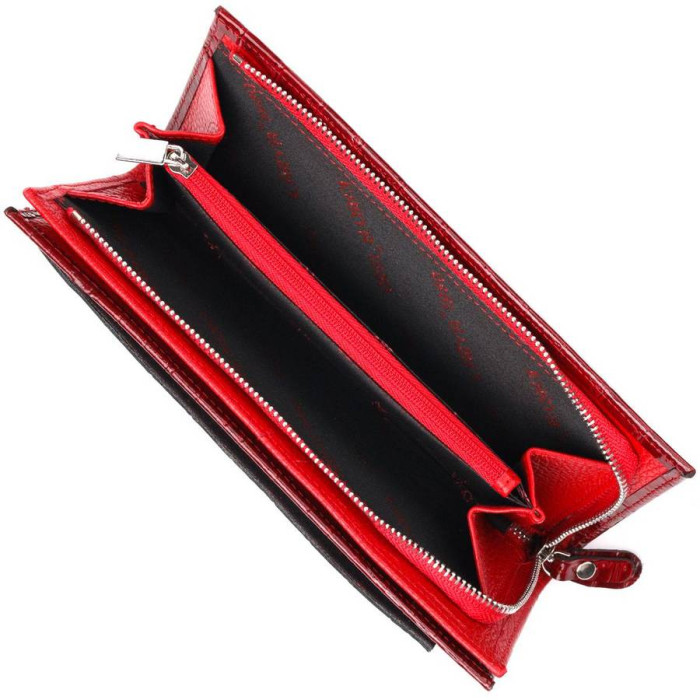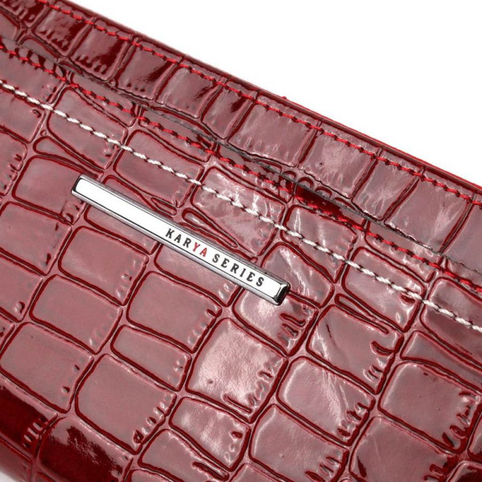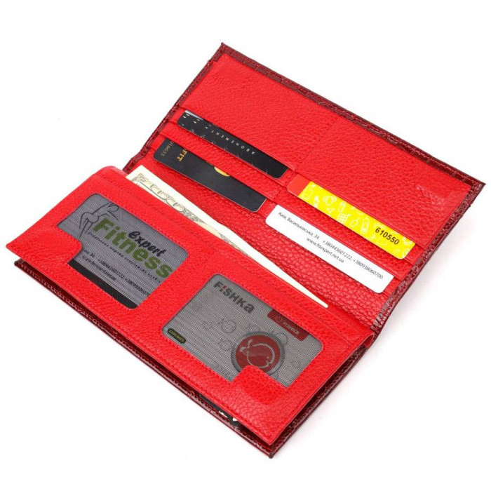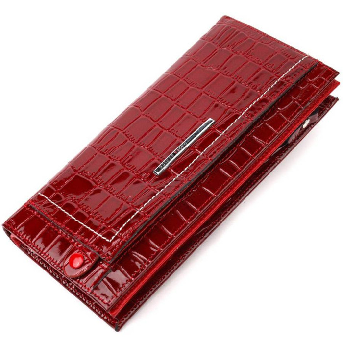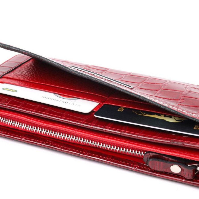 Яскравий жіночий гаманець з лакованої натуральної шкіри, з тисненням під крокодила. На лицьовій стороні блок для карток, який прошитий білою ниткою для декору та закривається хлястиком на кнопку. Всередині відділення для карт і документів, що закривається на магніти. Відділення на блискавці для купюр без складання. Запакований аксесуар у фірмову коробку та пакет бренду. Вироби з натуральної шкіри завжди будуть чудовим подарунком для близької людини.