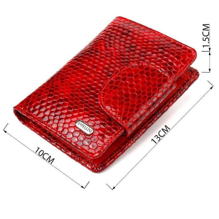 Лакований гаманець для жінок компактного розміру з натуральної шкіри, з тисненням під змію. Аксесуар має відділення для купюр з перегородкою, монетницю, що закривається клапаном на кнопку, приховану кишеню та сім відсіків для карток, два з них під сіточкою. Закривається аксесуар у два складання хлястиком на кнопку. Якісний шкіряний аксесуар завжди вважався показником смаку та достатку, саме такі вироби представлені у нашому магазині, у нас кожен знайде щось для себе.