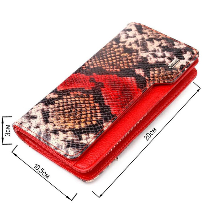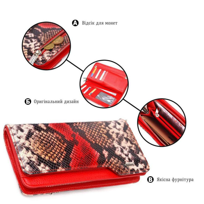 Яскравий жіночий гаманець-клатч, з натуральної фактурної шкіри з тисненням під змію – зовні, і з натуральної шкіри флотар – усередині. Аксесуар має одне основне відділення, в яке поміщаються купюри всіх номіналів, дванадцять кишень для карток, одна з яких під сіточкою, блок для карт із зовнішнього боку, дві кишеньки на блискавці, знімний кистьовий ремінь. Закривається аксесуар на блискавку, а блок для карток закривається на кнопки. Колір фурнітури – срібло. Шкіряний гаманець є дивовижним подарунком для дружини, колеги, подруги.