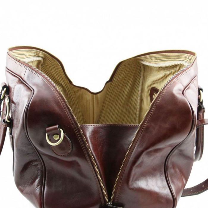 Особливість великий дорожньої сумки Voyager від італійського бренду Tuscany є ефектна латунна фурнітура з ефектом старіння. Для безпеки носіння речей всередині передбачена бавовняна підкладка.