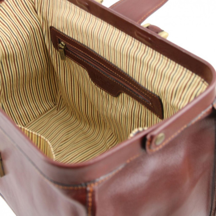 Склад: Full grain vegetable tanned leather hand-buffered, Бавовняна підкладка - Features: Semi-rigid structure, 1 відділення - Зовнішня частина: Захисні металеві ніжки на дні - Внутрішня частина: Внутрішня кишеня на блискавці - Металеві частини: Латунна фурнітура з ефектом старіння - Застібка: Металева застібка, Застібка "поцілунок" - Аксесуари: Мішечок для зберігання