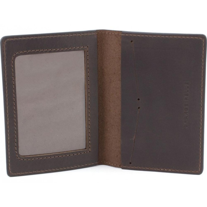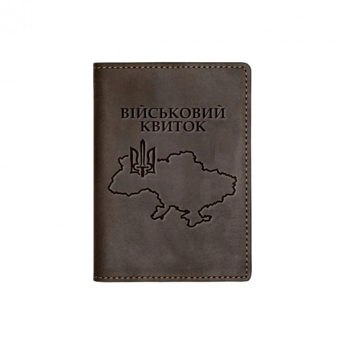 Grande Pelle 257120UA з коричневої матової шкіри crazy horse з малюнком "Кордон України" для військового квитка. Зліва - кишеня для карток, праворуч - кишеня та 2 слоти для карток. Виготовлена з натуральної шкіри, прострочена синтетичною ниткою. У комплекті - повстяний чохол. Вироблено в Україні.