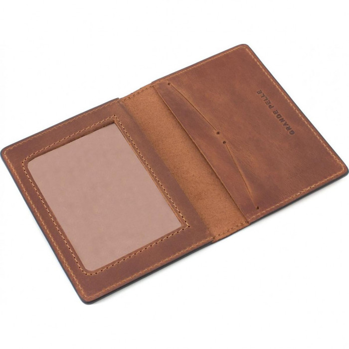 Grande Pelle 257123 шкіряна обкладинка для військового квитка: з рудої матової шкіри, 14*10см. Ліва сторона має прозоре вікно для карток та документів. Права сторона – кишеня для військового квитка та 2 слоти для карток. 100% натуральна шкіра, синтетична нитка для зносостійкості. Характеристики: