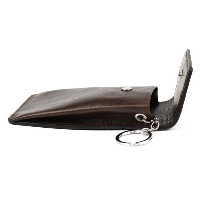 Закривається шкіряна ключниця на кнопку альфа. Усередині кільце для ключів на ланцюжку, що кріпиться до краю ключниці металевим люверсом.