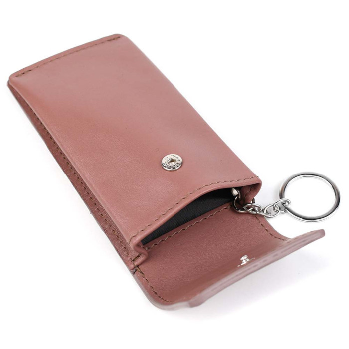Закривається шкіряна ключниця на кнопку альфа. Усередині кільце для ключів на ланцюжку, що кріпиться до краю ключниці металевим люверсом.