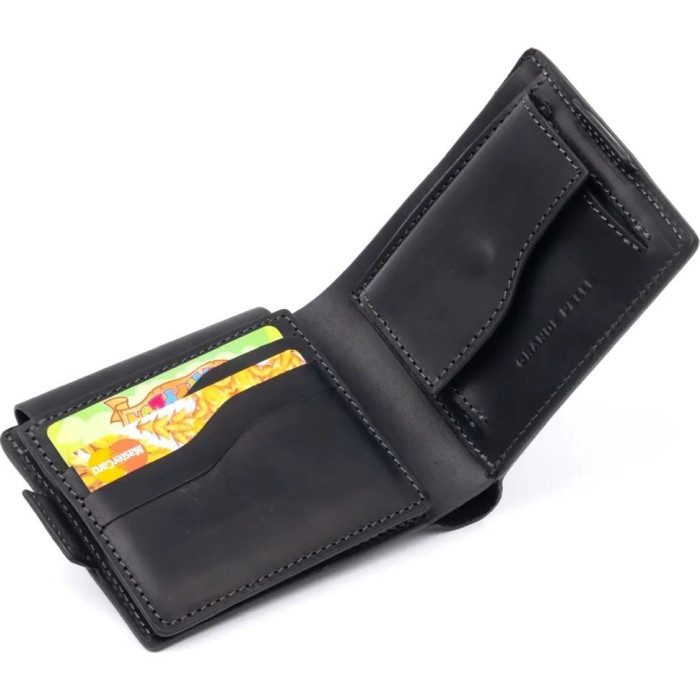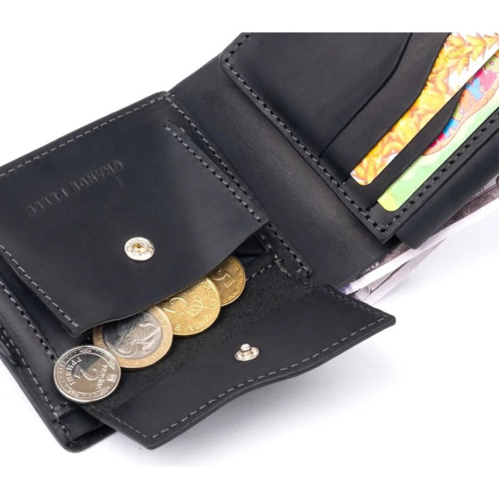 Портмоне пошитий з натуральної матової шкіри крейзі хорс, колір чорний. Гаманець із зручною монетницею. Стильне чоловіче портмоне радуватиме Вас у повсякденному житті.